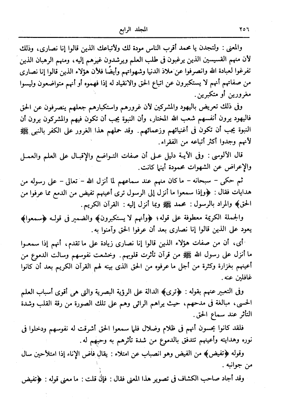 ثم حكى- سبحانه- ما كان منهم عند سماعهم لما أنزل الله- تعالى- على رسوله من هدايات فقال: وَإِذا سَمِعُوا ما أُنْزِلَ إِلَى الرَّسُولِ تَرى أَعْيُنَهُمْ تَفِيضُ مِنَ الدَّمْعِ مِمَّا عَرَفُوا مِنَ الْحَقِّ والمراد بالرسول: محمد صلى الله عليه وسلم وبما أنزل إليه: القرآن الكريم.