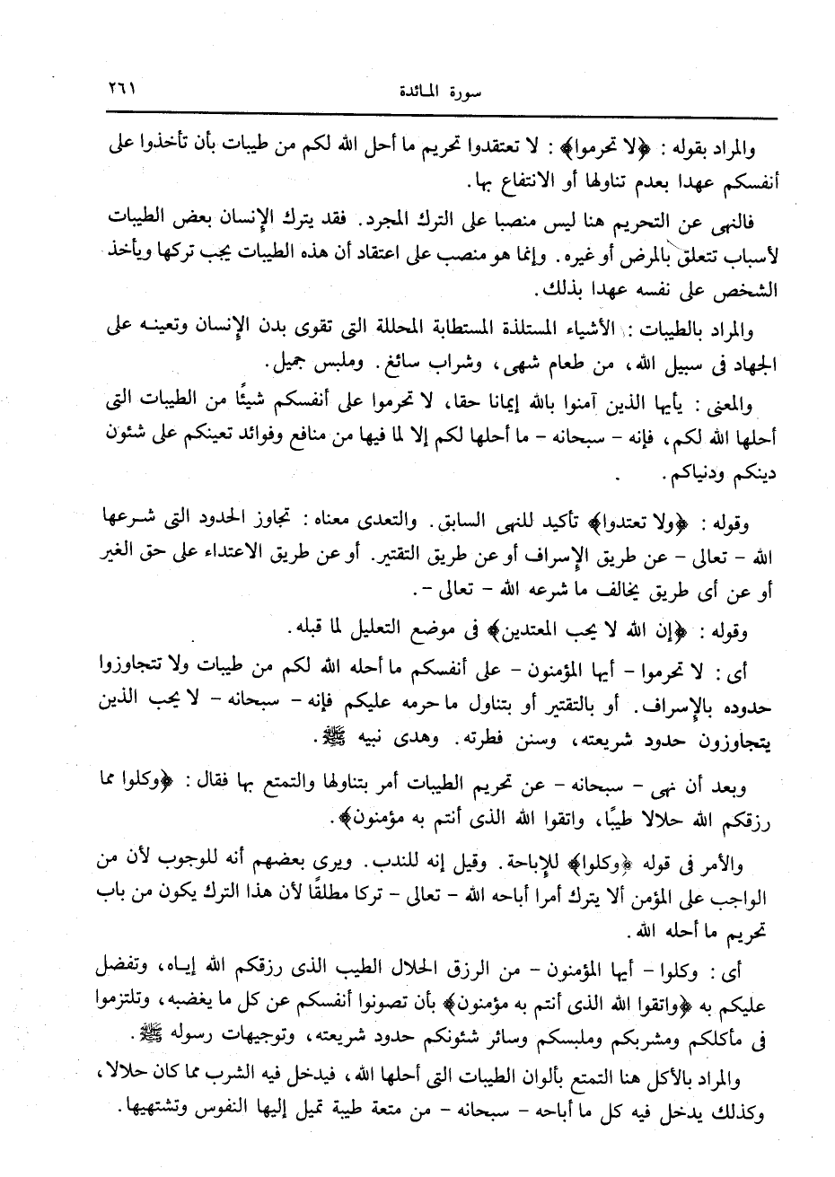 والمراد بقوله: لا تُحَرِّمُوا: لا تعتقدوا تحريم ما أحل الله لكم من طيبات بأن تأخذوا على أنفسكم عهدا بعدم تناولها أو الانتفاع بها.