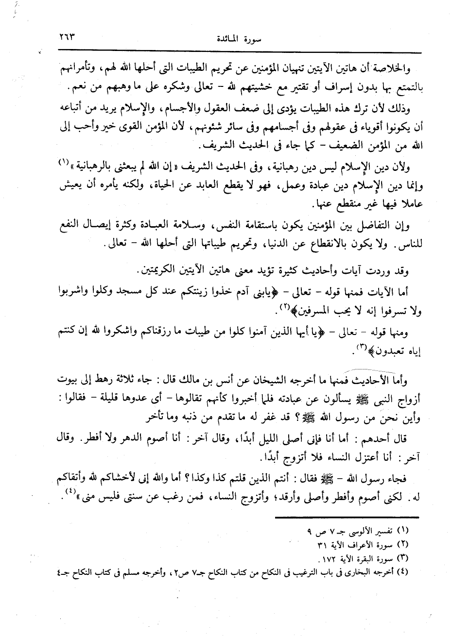 وذلك لأن ترك هذه الطيبات يؤدى إلى ضعف العقول والأجسام، والإسلام يريد من أتباعه أن يكونوا أقوياء في عقولهم وفي أجسامهم وفي سائر شئونهم، لأن المؤمن القوى خير وأحب إلى الله من المؤمن الضعيف- كما جاء في الحديث الشريف.