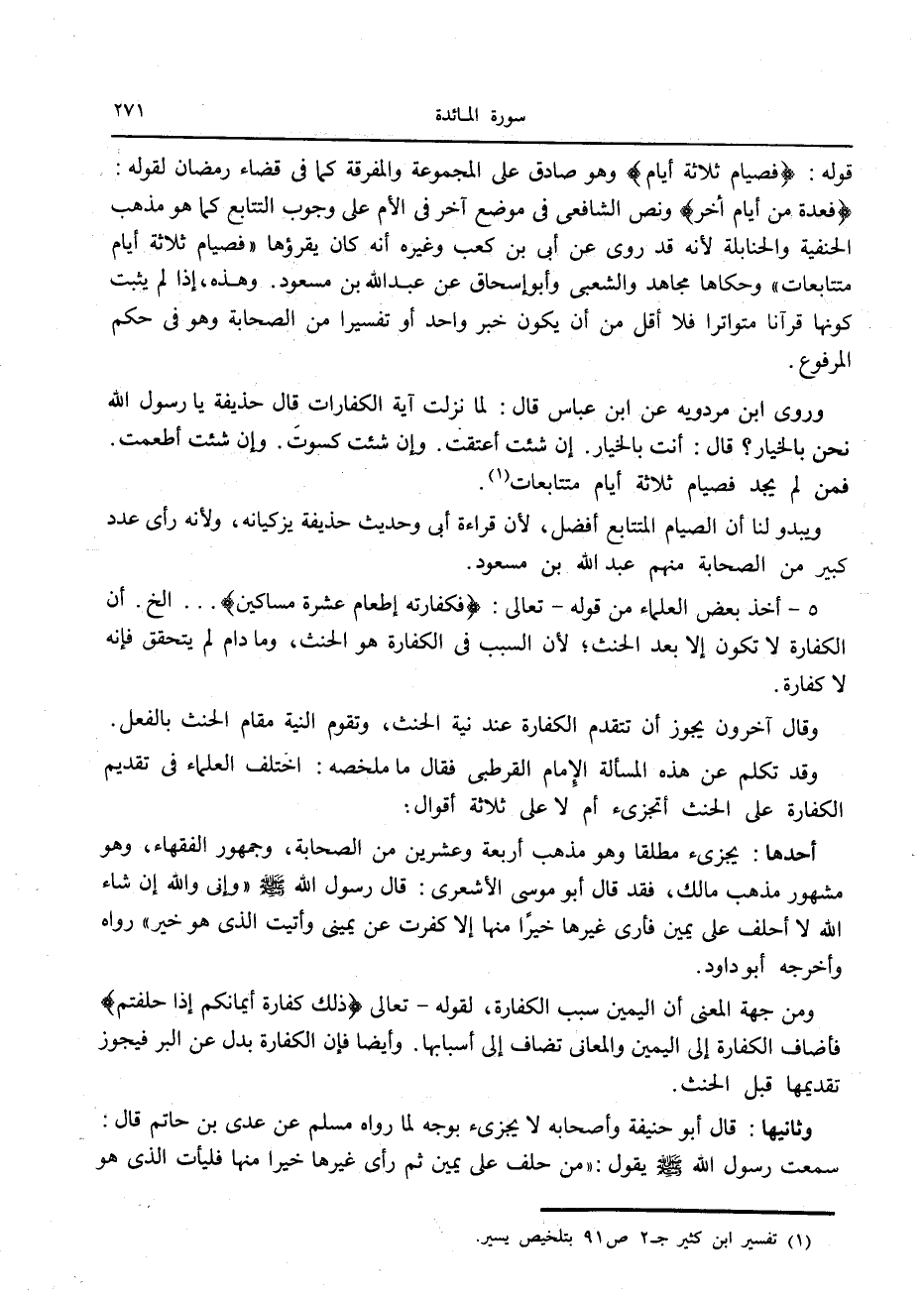 وروى ابن مردويه عن ابن عباس قال: لما نزلت آية الكفارات قال حذيفة يا رسول الله نحن بالخيار؟ قال: أنت بالخيار. إن شئت أعتقت. وإن شئت كسوت. وإن شئت أطعمت.