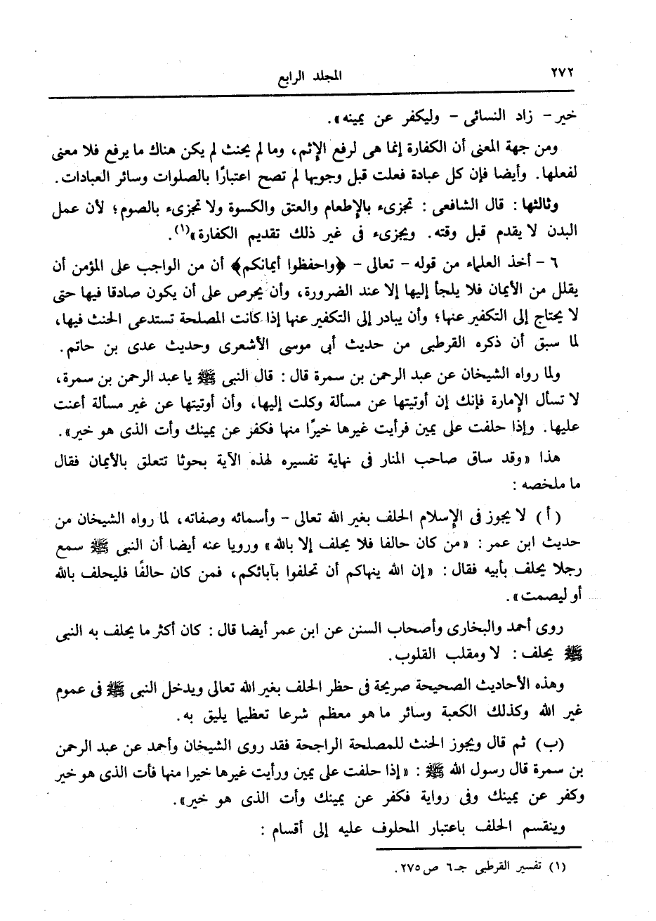 (ب) ثم قال ويجوز الحنث للمصلحة الراجحة فقد روى الشيخان وأحمد عن عبد الرحمن ابن سمرة قال رسول الله صلى الله عليه وسلم: «إذا حلفت على يمين ورأيت غيرها خيرا منها فأت الذي هو خير وكفر عن يمينك وفي رواية فكفر عن يمينك وأت الذي هو خير» .
