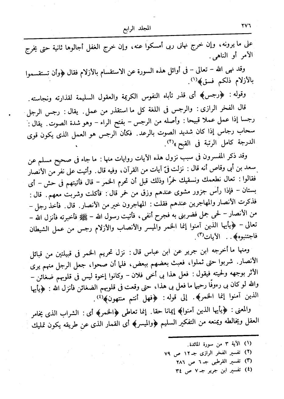 فذكرت الأنصار والمهاجرين عندهم فقلت: المهاجرون خير من الأنصار. قال. فأخذ رجل- من الأنصار- لحى جمل فضربني به فجرح أنفى، فأتيت رسول الله- صلى الله عليه وسلم فأخبرته فأنزل الله- تعالى- يا أَيُّهَا الَّذِينَ آمَنُوا إِنَّمَا الْخَمْرُ وَالْمَيْسِرُ وَالْأَنْصابُ وَالْأَزْلامُ رِجْسٌ مِنْ عَمَلِ الشَّيْطانِ فَاجْتَنِبُوهُ.. الآيات «3» .