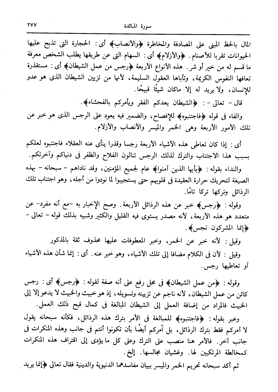 المال بالحظ المبنى على المصادفة والمخاطرة وَالْأَنْصابُ أى: الحجارة التي تذبح عليها الحيوانات تقربا للأصنام. وَالْأَزْلامُ أى: السهام التي عن طريقها يطلب الشخص معرفة ما قسم له من خير أو شر. هذه الأنواع الأربعة رِجْسٌ مِنْ عَمَلِ الشَّيْطانِ أى: مستقذرة تعافها النفوس الكريمة، وتأباها العقول السليمة، لأنها من تزيين الشيطان الذي هو عدو للإنسان، ولا يريد له إلا ما كان شيئا قبيحا.