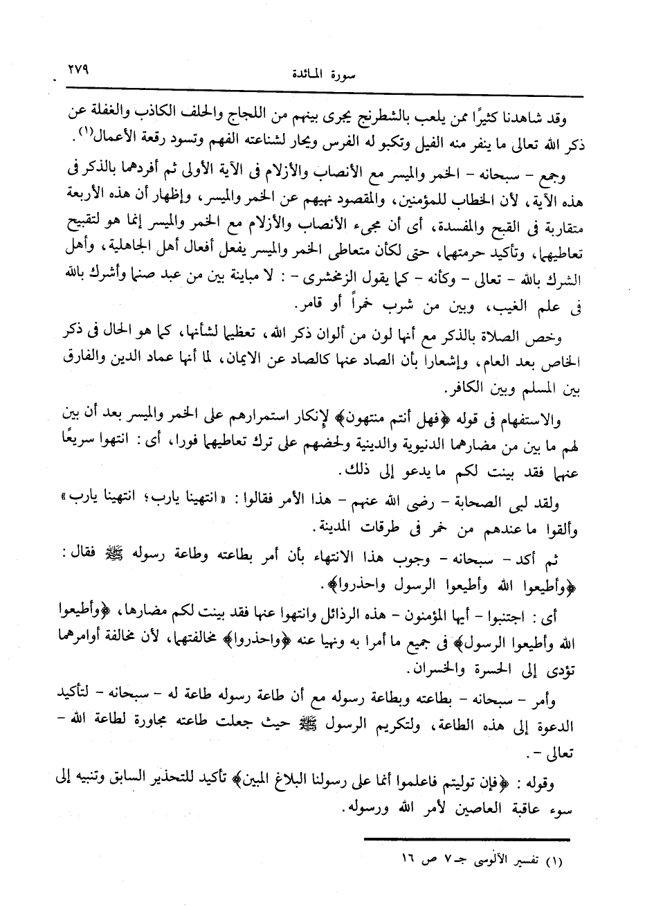 وجمع- سبحانه- الخمر والميسر مع الأنصاب والأزلام في الآية الأولى ثم أفردهما بالذكر في هذه الآية، لأن الخطاب للمؤمنين، والمقصود نهيهم عن الخمر والميسر، وإظهار أن هذه الأربعة متقاربة في القبح والمفسدة، أى أن مجيء الأنصاب والأزلام مع الخمر والميسر إنما هو لتقبيح تعاطيهما، وتأكيد حرمتهما، حتى لكأن متعاطى الخمر والميسر يفعل أفعال أهل الجاهلية، وأهل الشرك بالله- تعالى- وكأنه- كما يقول الزمخشري-: لا مباينة بين من عبد صنما وأشرك بالله في علم الغيب، وبين من شرب خمرا أو قامر.