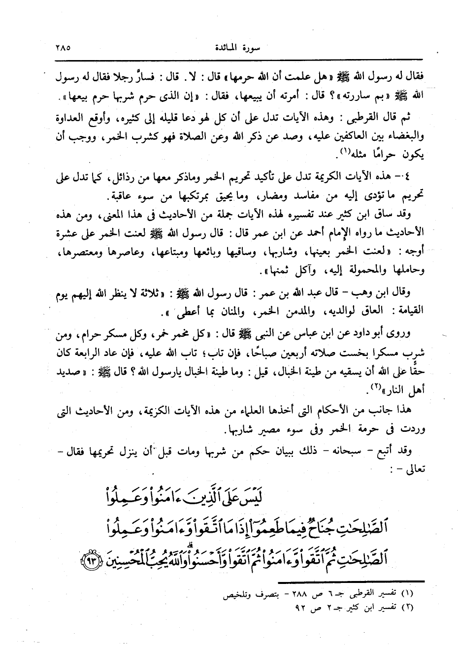 وقد ساق ابن كثير عند تفسيره لهذه الآيات جملة من الأحاديث في هذا المعنى، ومن هذه الأحاديث ما رواه الإمام أحمد عن ابن عمر قال: قال رسول الله صلى الله عليه وسلم لعنت الخمر على عشرة أوجه: «لعنت الخمر بعينها، وشاربها، وساقيها وبائعها ومبتاعها، وعاصرها ومعتصرها، وحاملها والمحمولة إليه، وآكل ثمنها» .