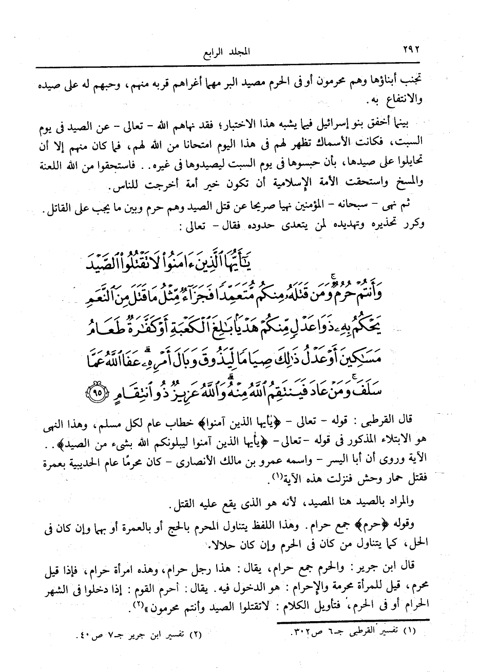 يا أَيُّهَا الَّذِينَ آمَنُوا لا تَقْتُلُوا الصَّيْدَ وَأَنْتُمْ حُرُمٌ وَمَنْ قَتَلَهُ مِنْكُمْ مُتَعَمِّداً فَجَزاءٌ مِثْلُ ما قَتَلَ مِنَ النَّعَمِ يَحْكُمُ بِهِ ذَوا عَدْلٍ مِنْكُمْ هَدْياً بالِغَ الْكَعْبَةِ أَوْ كَفَّارَةٌ طَعامُ مَساكِينَ أَوْ عَدْلُ ذلِكَ صِياماً لِيَذُوقَ وَبالَ أَمْرِهِ عَفَا اللَّهُ عَمَّا سَلَفَ وَمَنْ عادَ فَيَنْتَقِمُ اللَّهُ مِنْهُ وَاللَّهُ عَزِيزٌ ذُو انْتِقامٍ (95)
