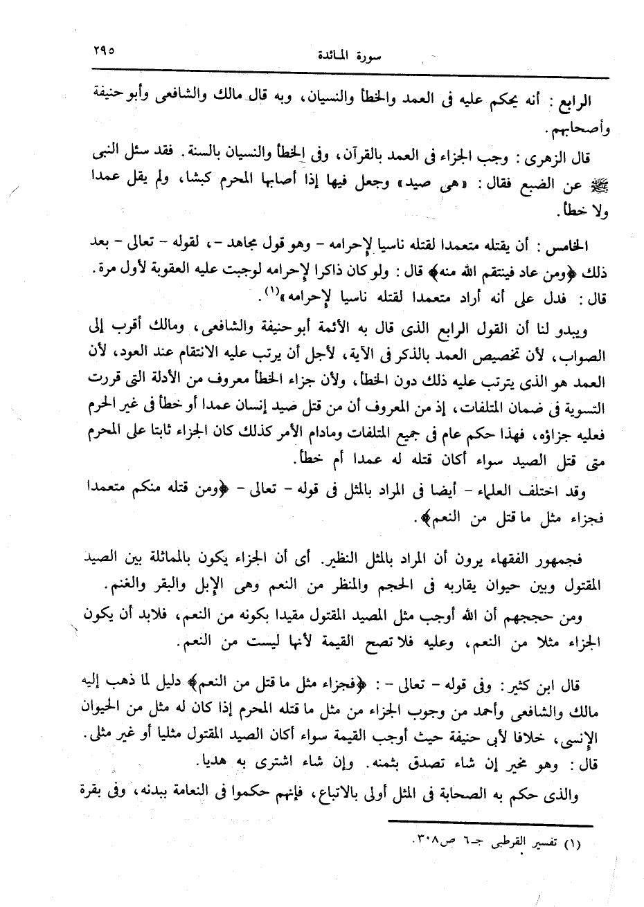ويبدو لنا أن القول الرابع الذي قال به الأئمة أبو حنيفة والشافعى، ومالك أقرب إلى الصواب، لأن تخصيص العمد بالذكر في الآية، لأجل أن يرتب عليه الانتقام عند العود، لأن العمد هو الذي يترتب عليه ذلك دون الخطأ، ولأن جزاء الخطأ معروف من الأدلة التي قررت التسوية في ضمان المتلفات، إذ من المعروف أن من قتل صيد إنسان عمدا أو خطأ في غير الحرم فعليه جزاؤه، فهذا حكم عام في جميع المتلفات ومادام الأمر كذلك كان الجزاء ثابتا على المحرم متى قتل الصيد سواء أكان قتله له عمدا أم خطأ.