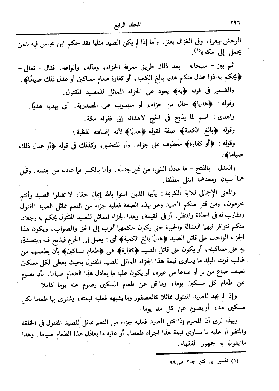 والمعنى الإجمالى للآية الكريمة: يا أيها الذين آمنوا بالله إيمانا حقا، لا تقتلوا الصيد وأنتم محرمون، ومن قتل منكم الصيد وهو بهذه الصفة فعليه جزاء من النعم مماثل الصيد المقتول ومقارب له في الخلقة والمنظر، أو في القيمة، وهذا الجزاء المماثل للصيد المقتول يحكم به رجلان منكم تتوافر فيهما العدالة والخبرة حتى يكون حكمهما أقرب إلى الحق والصواب، ويكون هذا الجزاء الواجب على قاتل الصيد هَدْياً بالِغَ الْكَعْبَةِ أى: يصل إلى الحرم فيذبح فيه ويتصدق به على مساكينه، أو يكون على قاتل الصيد كَفَّارَةٌ هي طَعامُ مَساكِينَ بأن يطعمهم من غالب قوت البلد ما يساوى قيمة هذا الجزاء المماثل للصيد المقتول بحيث يعطى لكل مسكين نصف صاغ من بر أو صاعا من غيره، أو يكون عليه ما يعادل هذا الطعام صياما، بأن يصوم عن طعام كل مسكين يوما، وما قل عن طعام المسكين يصوم عنه يوما كاملا.
