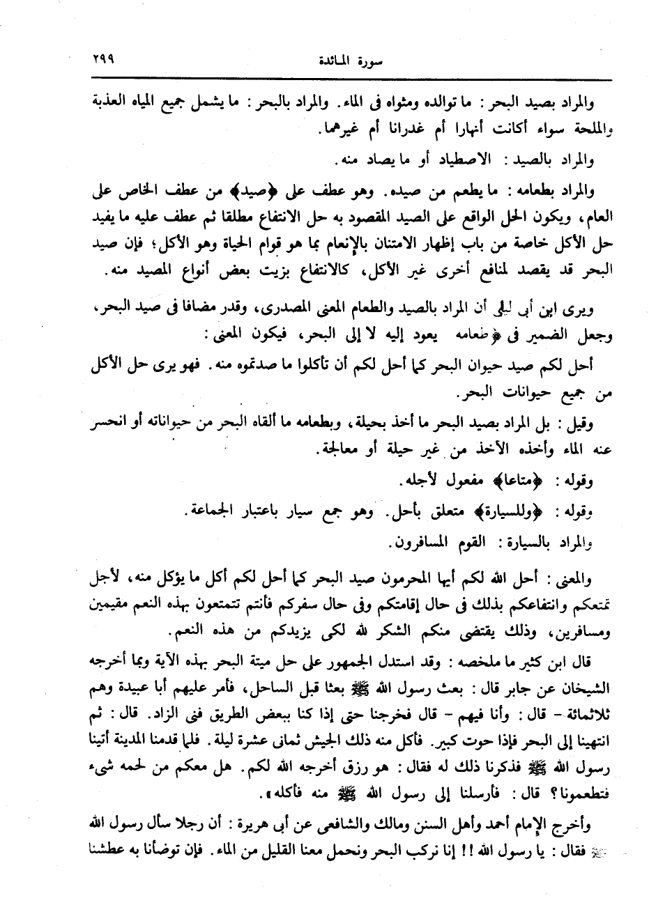 قال ابن كثير ما ملخصه: وقد استدل الجمهور على حل ميتة البحر بهذه الآية وبما أخرجه الشيخان عن جابر قال: بعث رسول الله صلى الله عليه وسلم بعثا قبل الساحل، فأمر عليهم أبا عبيدة وهم ثلاثمائة- قال: وأنا فيهم- قال فخرجنا حتى إذا كنا ببعض الطريق فنى الزاد. قال: ثم انتهينا إلى البحر فإذا حوت كبير. فأكل منه ذلك الجيش ثماني عشرة ليلة. فلما قدمنا المدينة أتينا رسول الله صلى الله عليه وسلم فذكرنا ذلك له فقال: هو رزق أخرجه الله لكم. هل معكم من لحمه شيء فتطعمونا؟ قال: فأرسلنا إلى رسول الله صلى الله عليه وسلم منه فأكله» .