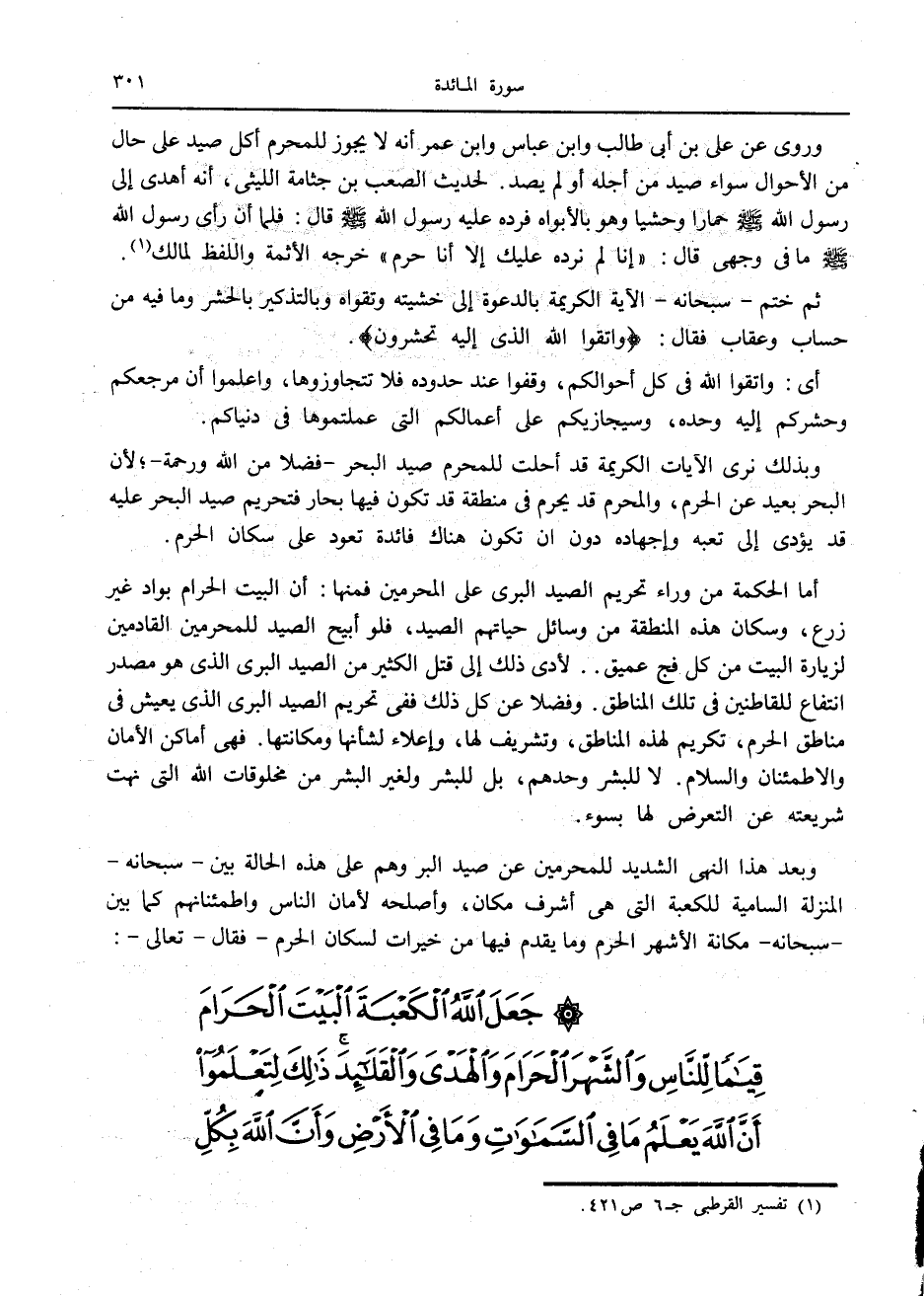 وبعد هذا النهى الشديد للمحرمين عن صيد البر وهم على هذه الحالة بين- سبحانه- المنزلة السامية للكعبة التي هي أشرف مكان، وأصلحه لأمان الناس واطمئنانهم كما بين- سبحانه- مكانة الأشهر الحرم وما يقدم فيها من خيرات لسكان الحرم- فقال- تعالى-: