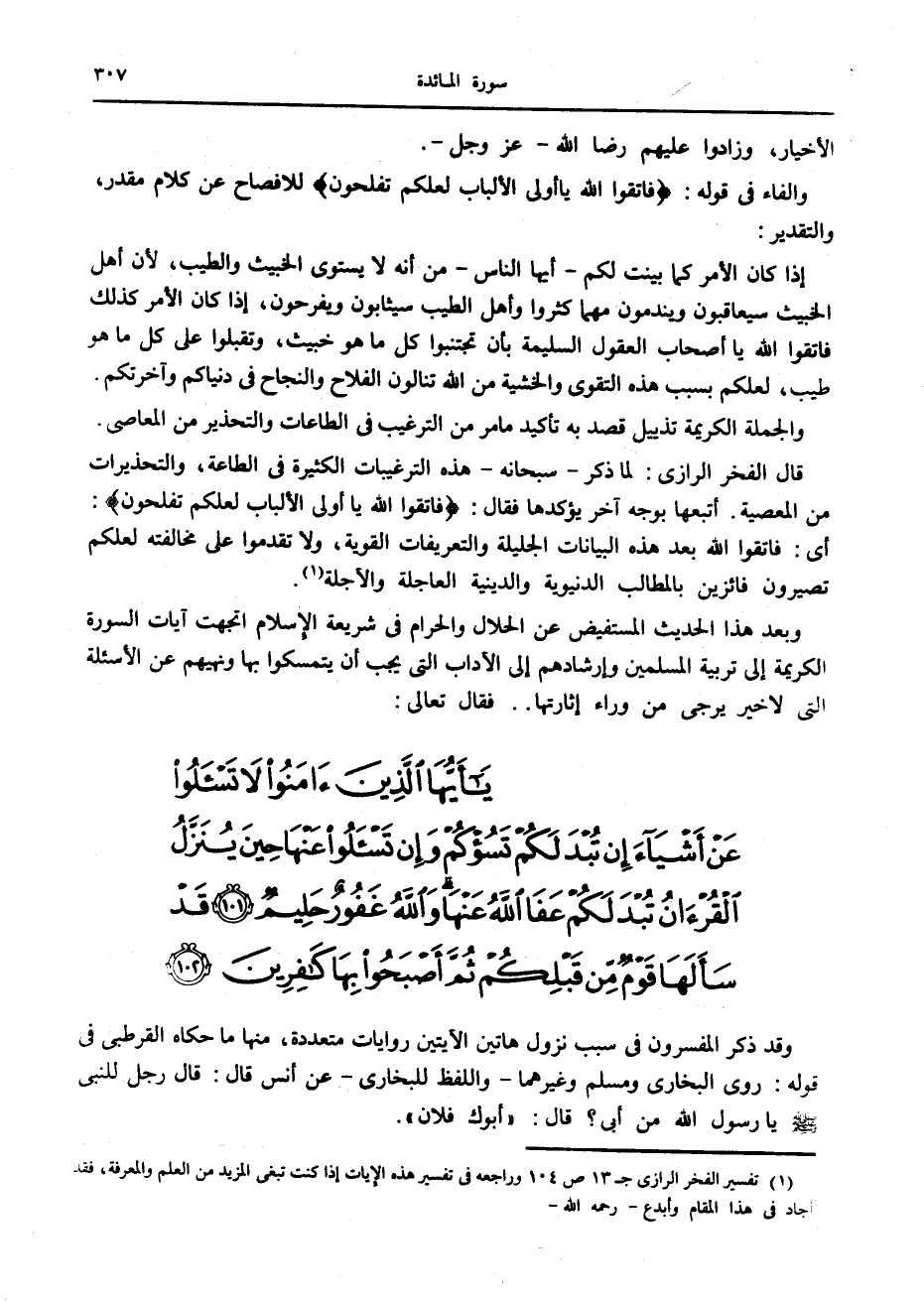 يا أَيُّهَا الَّذِينَ آمَنُوا لا تَسْئَلُوا عَنْ أَشْياءَ إِنْ تُبْدَ لَكُمْ تَسُؤْكُمْ وَإِنْ تَسْئَلُوا عَنْها حِينَ يُنَزَّلُ الْقُرْآنُ تُبْدَ لَكُمْ عَفَا اللَّهُ عَنْها وَاللَّهُ غَفُورٌ حَلِيمٌ (101) قَدْ سَأَلَها قَوْمٌ مِنْ قَبْلِكُمْ ثُمَّ أَصْبَحُوا بِها كافِرِينَ (102)
