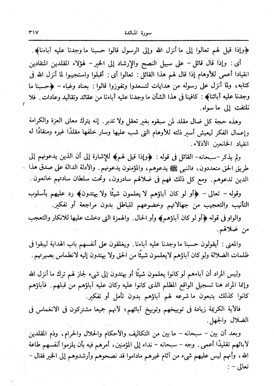 وليس المراد أن آباءهم لو كانوا يعلمون شيئا أو يهتدون إلى شيء لجاز لهم ترك ما أنزل الله وإنما المراد هنا تسجيل الواقع المظلم الذي كانوا عليه وكان عليه آباؤهم من قبلهم. فآباؤهم كانوا كذلك يتبعون ما شرعه لهم آباؤهم بدون تأمل أو تفكير.