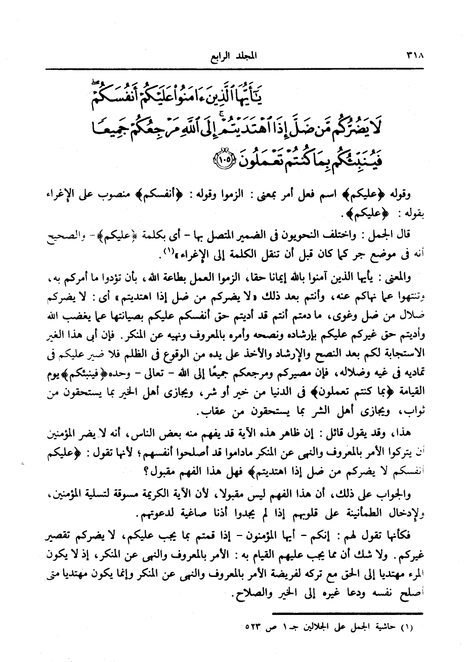 يا أَيُّهَا الَّذِينَ آمَنُوا عَلَيْكُمْ أَنْفُسَكُمْ لا يَضُرُّكُمْ مَنْ ضَلَّ إِذَا اهْتَدَيْتُمْ إِلَى اللَّهِ مَرْجِعُكُمْ جَمِيعاً فَيُنَبِّئُكُمْ بِما كُنْتُمْ تَعْمَلُونَ (105)