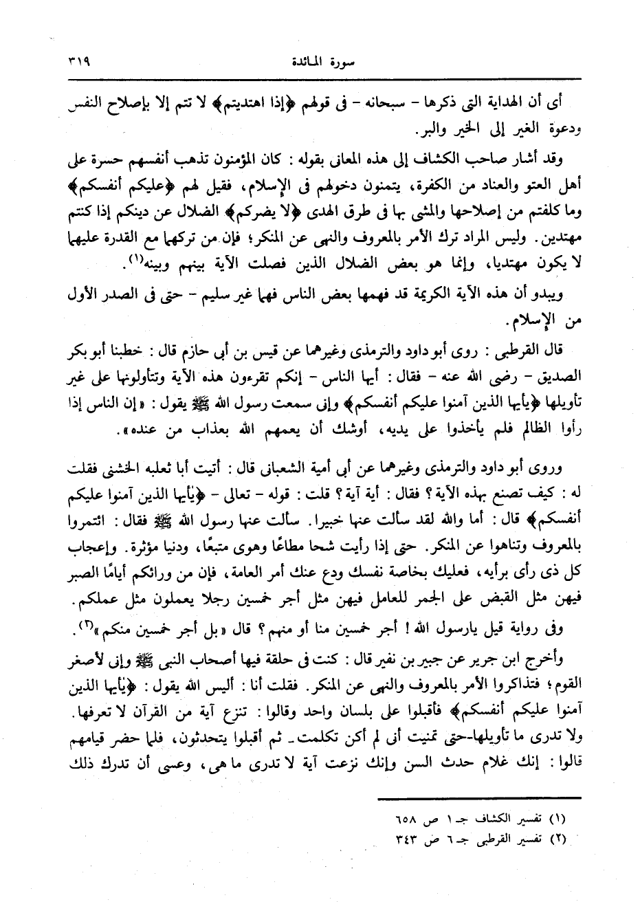 قال القرطبي: روى أبو داود والترمذي وغيرهما عن قيس بن أبى حازم قال: خطبنا أبو بكر الصديق- رضى الله عنه- فقال: أيها الناس- إنكم تقرءون هذه الآية وتتأولونها على غير تأويلها يا أَيُّهَا الَّذِينَ آمَنُوا عَلَيْكُمْ أَنْفُسَكُمْ وإنى سمعت رسول الله صلى الله عليه وسلم يقول: «إن الناس إذا رأوا الظالم فلم يأخذوا على يديه، أوشك أن يعمهم الله بعذاب من عنده» .