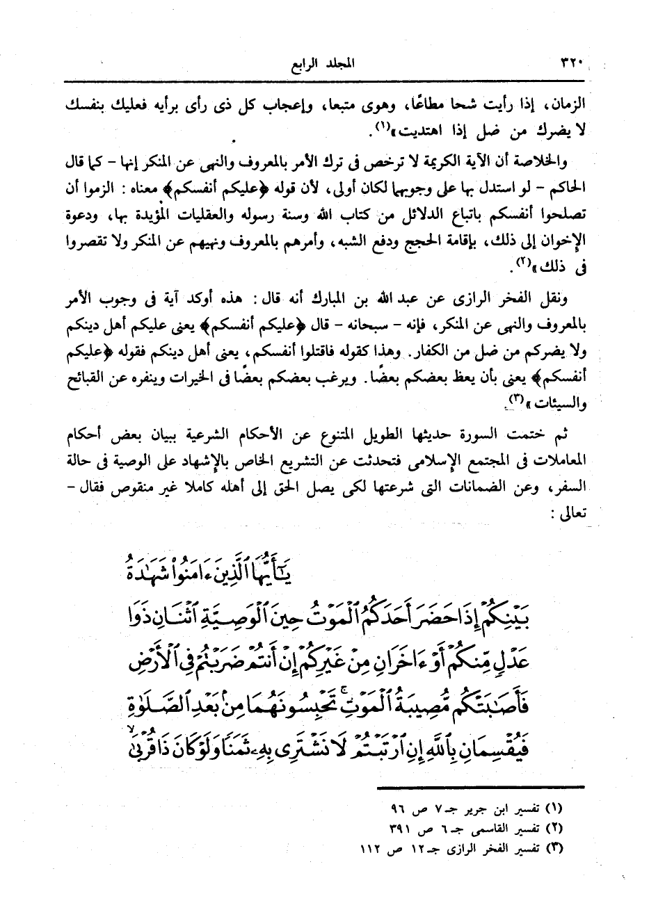 ونقل الفخر الرازي عن عبد الله بن المبارك أنه قال: هذه أوكد آية في وجوب الأمر بالمعروف والنهى عن المنكر، فإنه- سبحانه- قال عَلَيْكُمْ أَنْفُسَكُمْ يعنى عليكم أهل دينكم ولا يضركم من ضل من الكفار. وهذا كقوله فاقتلوا أنفسكم، يعنى أهل دينكم فقوله عَلَيْكُمْ أَنْفُسَكُمْ يعنى بأن يعظ بعضكم بعضا. ويرغب بعضكم بعضا في الخيرات وينفره عن القبائح والسيئات» «3» ثم ختمت السورة حديثها الطويل المتنوع عن الأحكام الشرعية ببيان بعض أحكام المعاملات في المجتمع الإسلامى فتحدثت عن التشريع الخاص بالإشهاد على الوصية في حالة السفر، وعن الضمانات التي شرعتها لكي يصل الحق إلى أهله كاملا غير منقوص فقال- تعالى: