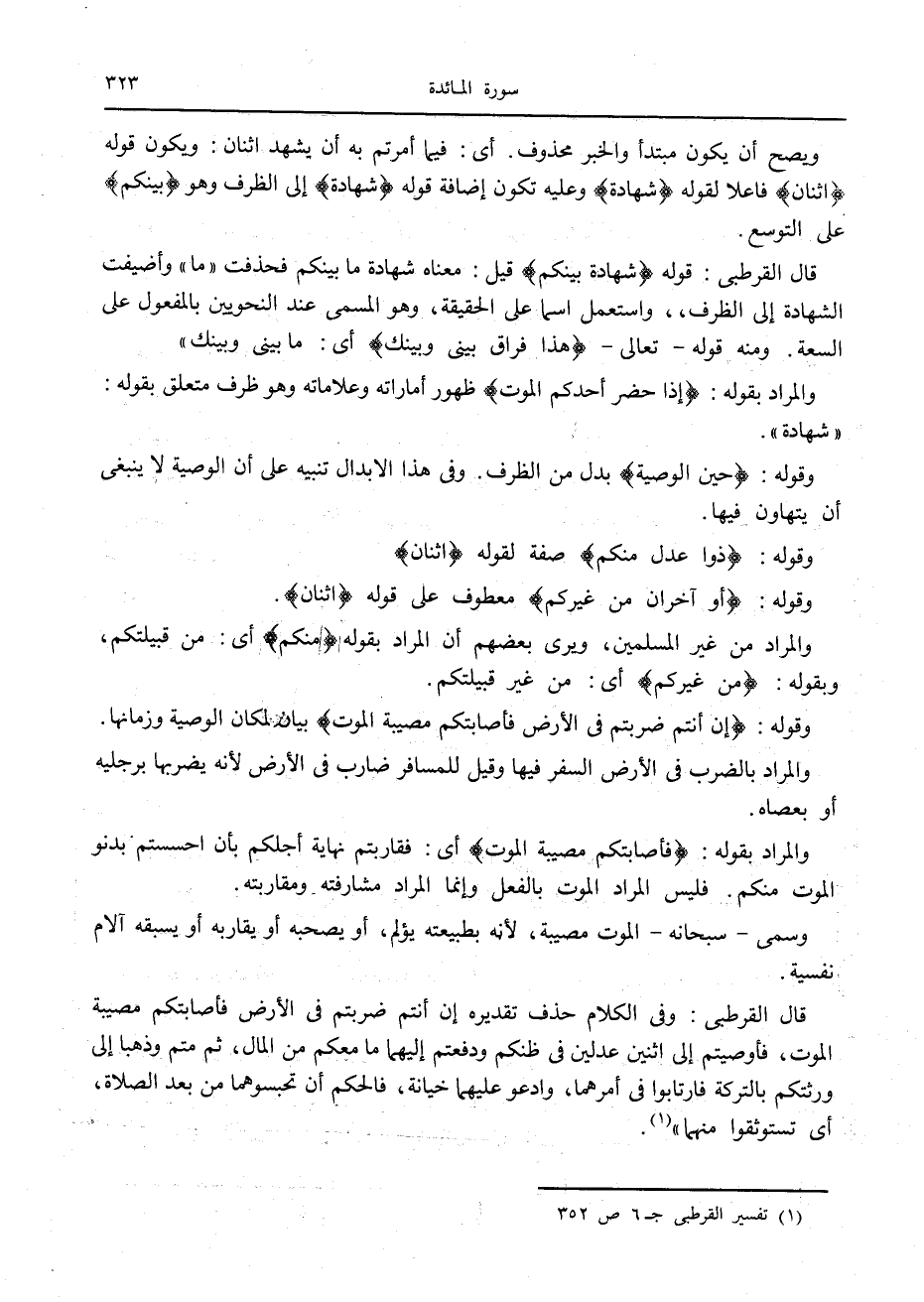 قال القرطبي: قوله شَهادَةُ بَيْنِكُمْ قيل: معناه شهادة ما بينكم فحذفت «ما» وأضيفت الشهادة إلى الظرف،، واستعمل اسما على الحقيقة، وهو المسمى عند النحويين بالمفعول على السعة. ومنه قوله- تعالى- هذا فِراقُ بَيْنِي وَبَيْنِكَ أى،: ما بيني وبينك» والمراد بقوله: إِذا حَضَرَ أَحَدَكُمُ الْمَوْتُ ظهور أماراته وعلاماته وهو ظرف متعلق بقوله: