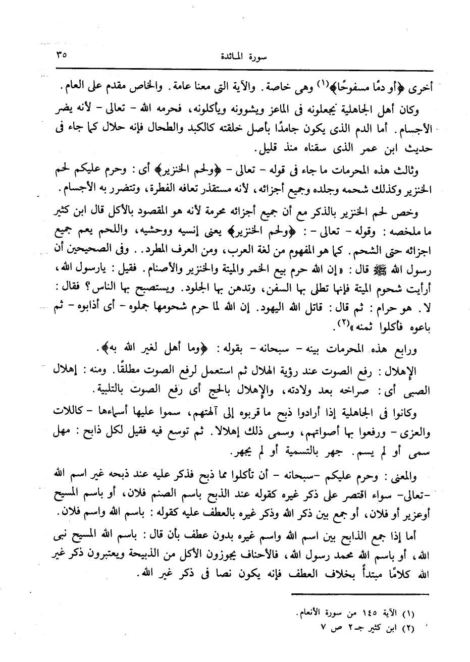 وخص لحم الخنزير بالذكر مع أن جميع أجزائه محرمة لأنه هو المقصود بالأكل قال ابن كثير ما ملخصه: وقوله- تعالى-: وَلَحْمُ الْخِنْزِيرِ يعنى إنسيه ووحشيه، واللحم يعم جميع أجزائه حتى الشحم. كما هو المفهوم من لغة العرب، ومن العرف المطرد.. وفي الصحيحين أن رسول الله صلّى الله عليه وسلّم قال: «إن الله حرم بيع الخمر والميتة والخنزير والأصنام. فقيل: يا رسول الله، أرأيت شحوم الميتة فإنها تطلى بها السفن، وتدهن بها الجلود. ويستصبح بها الناس؟ فقال:
