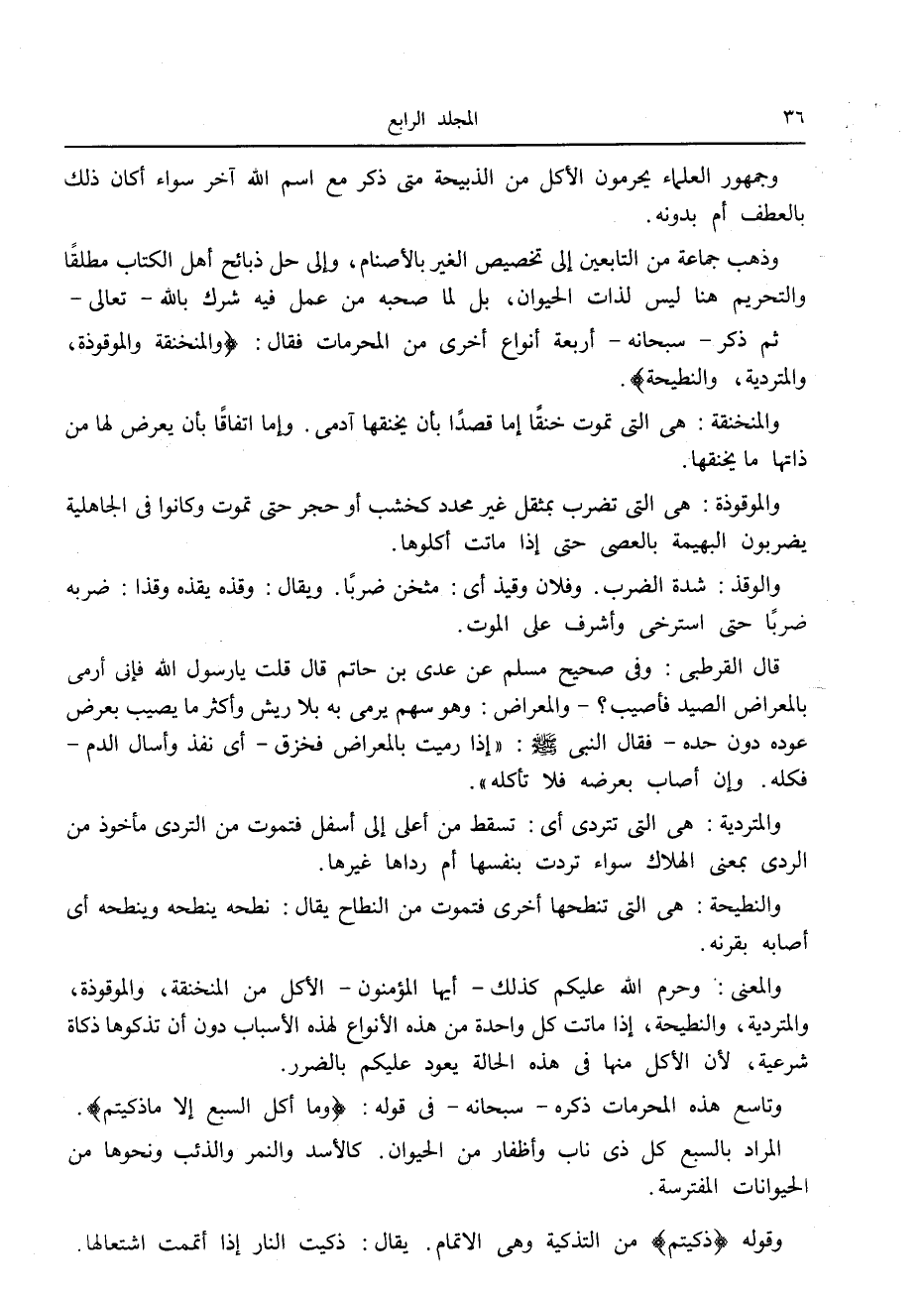 وذهب جماعة من التابعين إلى تخصيص الغير بالأصنام، وإلى حل ذبائح أهل الكتاب مطلقا والتحريم هنا ليس لذات الحيوان، بل لما صحبه من عمل فيه شرك بالله- تعالى- ثم ذكر- سبحانه- أربعة أنواع أخرى من المحرمات فقال: وَالْمُنْخَنِقَةُ وَالْمَوْقُوذَةُ، وَالْمُتَرَدِّيَةُ، وَالنَّطِيحَةُ.