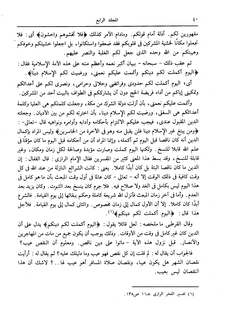 وَمَنْ يَبْتَغِ غَيْرَ الْإِسْلامِ دِيناً فَلَنْ يُقْبَلَ مِنْهُ وَهُوَ فِي الْآخِرَةِ مِنَ الْخاسِرِينَ وليس المراد بإكمال الدين أنه كان ناقصا قبل اليوم ثم أكمله، وإنما المراد أن من أحكامه قبل اليوم ما كان مؤقتا في علم الله قابلا للنسخ. ولكنها اليوم كملت وصارت مؤبدة وصالحة لكل زمان ومكان، وغير قابلة للنسخ، وقد بسط هذا المعنى كثير من المفسرين فقال الإمام الرازي: قال القفال: إن الدين ما كان ناقصا البتة بل كان أبدا كاملا. يعنى: كانت الشرائع النازلة من عند الله في كل وقت كافية في ذلك الوقت إلا أنه- تعالى- كان عالما في أول وقت المبعث بأن ما هو كامل في هذا اليوم ليس بكامل في الغد ولا صلاح فيه. فلا جرم كان ينسخ بعد الثبوت. وكان يزيد بعد العدم. وأما في آخر زمان المبعث فأنزل الله شريعة كاملة وحكم ببقائها إلى يوم القيامة. فالشرع أبدا كان كاملا. إلا أن الأول كمال إلى زمان مخصوص. والثاني كمال إلى يوم القيامة. فالأجل هذا قال: الْيَوْمَ أَكْمَلْتُ لَكُمْ دِينَكُمْ «1» .