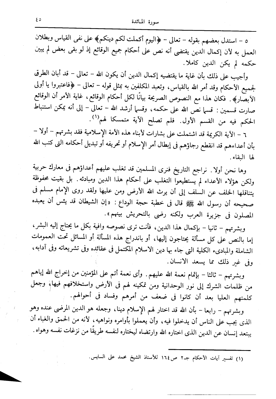 5- استدل بعضهم بقوله- تعالى- الْيَوْمَ أَكْمَلْتُ لَكُمْ دِينَكُمْ على نفى القياس وبطلان العمل به لأن إكمال الدين يقتضى أنه نص على أحكام جميع الوقائع إذ لو بقي بعض لم يبين حكمه لم يكن الدين كاملا.