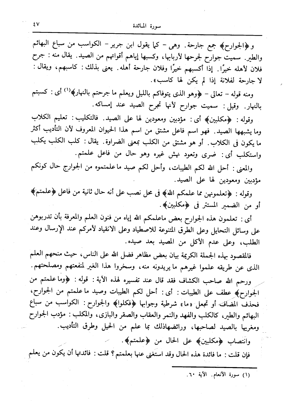 ورحم الله صاحب الكشاف فقد قال عند تفسيره لهذه الآية: قوله: وَما عَلَّمْتُمْ مِنَ الْجَوارِحِ عطف على الطيبات: أى: أحل لكم الطيبات وصيد ما علمتم من الجوارح، فحذف المضاف أو تجعل «ما» شرطية وجوابها فَكُلُوا والجوارح: الكواسب من سباع البهائم والطير، كالكلب والفهد والنمر والعقاب والصقر والبازي، والمكلب: مؤدب الجوارح ومغريها بالصيد لصاحبها، ورائضها ذلك بما علم من الحيل وطرق التأديب.