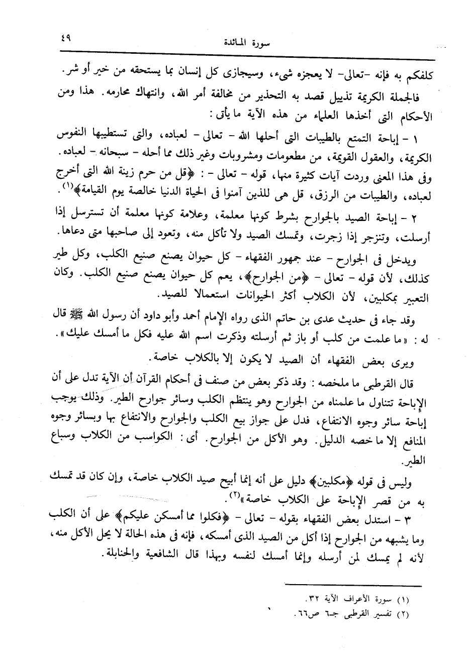 قال القرطبي ما ملخصه: وقد ذكر بعض من صنف في أحكام القرآن أن الآية تدل على أن الإباحة تتناول ما علمناه من الجوارح وهو ينتظم الكلب وسائر جوارح الطير. وذلك يوجب إباحة سائر وجوه الانتفاع، فدل على جواز بيع الكلب والجوارح والانتفاع بها وبسائر وجوه المنافع إلا ما خصه الدليل. وهو الأكل من الجوارح. أى: الكواسب من الكلاب وسباع الطير.
