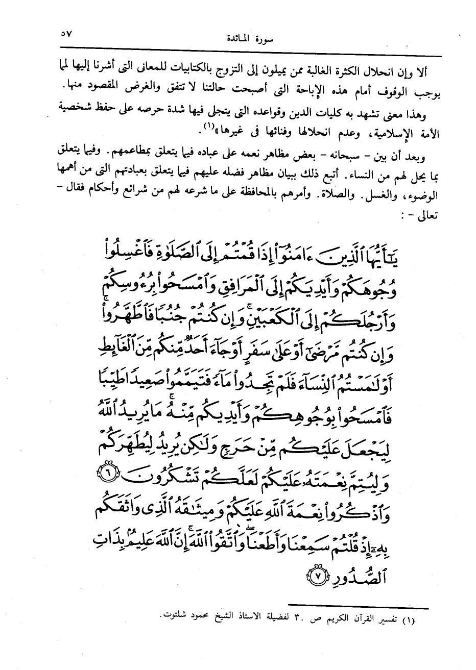 وبعد أن بين- سبحانه- بعض مظاهر نعمه على عباده فيما يتعلق بمطاعمهم. وفيما يتعلق بما يحل لهم من النساء. أتبع ذلك ببيان مظاهر فضله عليهم فيما يتعلق بعبادتهم التي من أهمها الوضوء، والغسل. والصلاة. وأمرهم بالمحافظة على ما شرعه لهم من شرائع وأحكام فقال- تعالى-: