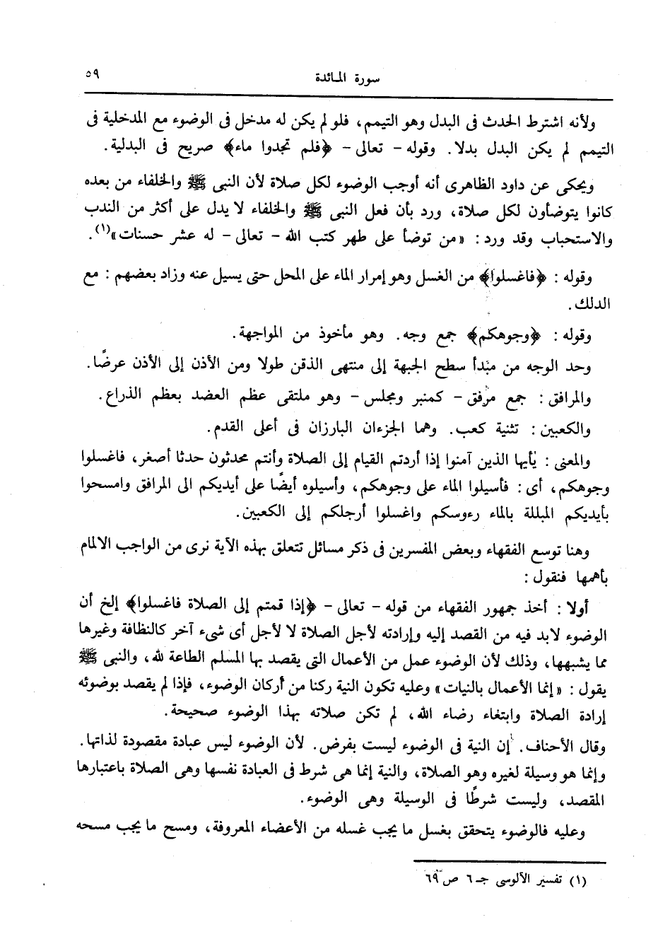 أولا: أخذ جمهور الفقهاء من قوله- تعالى- إِذا قُمْتُمْ إِلَى الصَّلاةِ فَاغْسِلُوا إلخ أن الوضوء لا بد فيه من القصد إليه وإرادته لأجل الصلاة لا لأجل أى شيء آخر كالنظافة وغيرها مما يشبهها، وذلك لأن الوضوء عمل من الأعمال التي يقصد بها المسلم الطاعة لله، والنبي صلى الله عليه وسلّم يقول: «إنما الأعمال بالنيات» وعليه تكون النية ركنا من أركان الوضوء، فإذا لم يقصد بوضوئه إرادة الصلاة وابتغاء رضاء الله، لم تكن صلاته بهذا الوضوء صحيحة.
