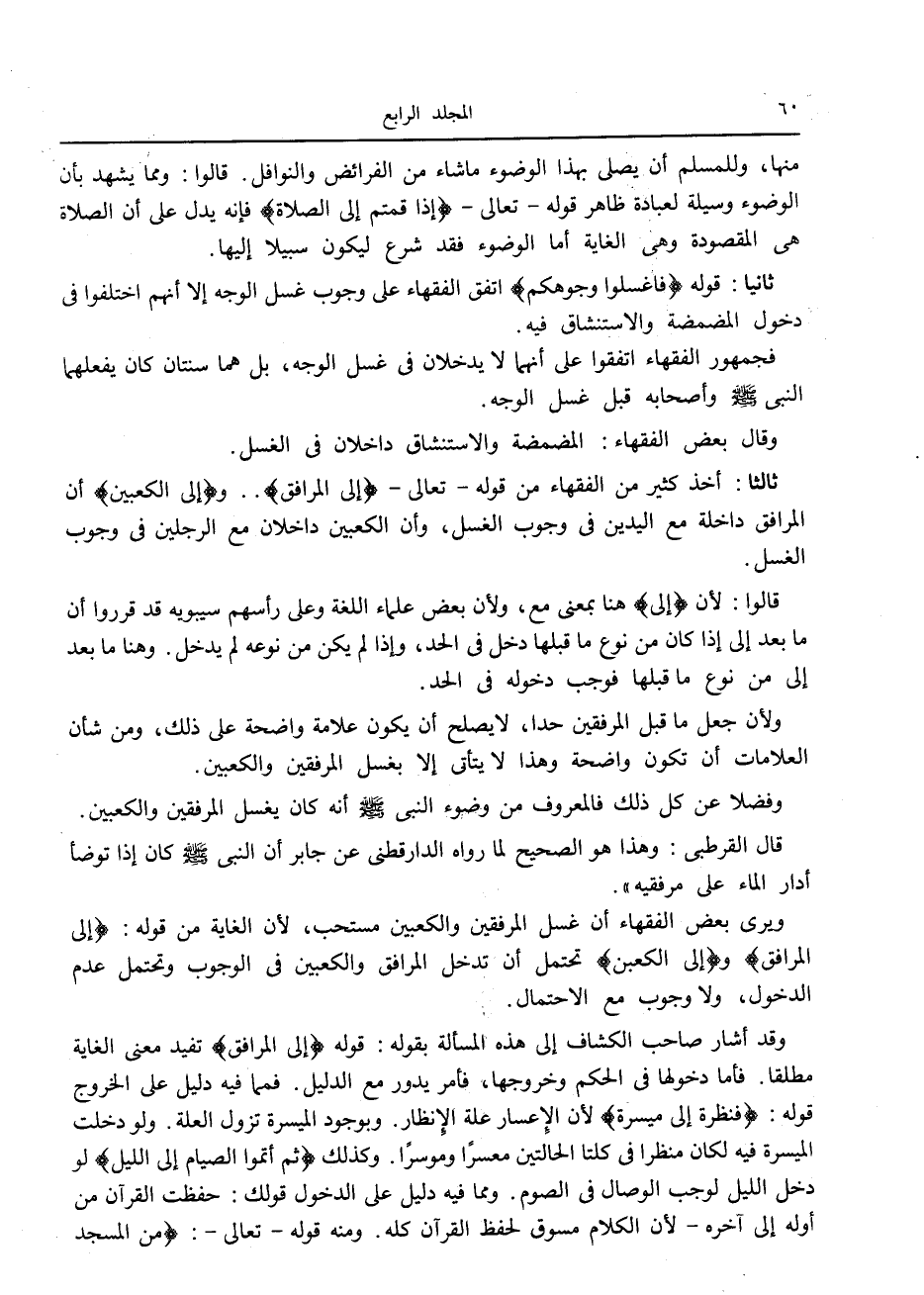 ثالثا: أخذ كثير من الفقهاء من قوله- تعالى- إِلَى الْمَرافِقِ.. وإِلَى الْكَعْبَيْنِ أن المرافق داخلة مع اليدين في وجوب الغسل، وأن الكعبين داخلان مع الرجلين في وجوب الغسل.