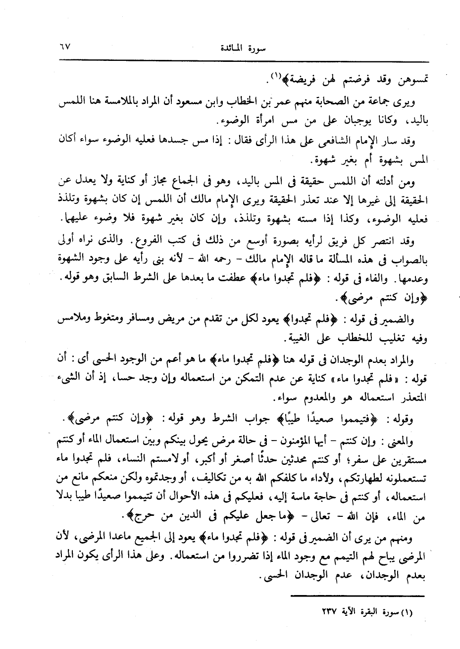 وقد انتصر كل فريق لرأيه بصورة أوسع من ذلك في كتب الفروع. والذي نراه أولى بالصواب في هذه المسألة ما قاله الإمام مالك- رحمه الله- لأنه بنى رأيه على وجود الشهوة وعدمها. والفاء في قوله: فَلَمْ تَجِدُوا ماءً عطفت ما بعدها على الشرط السابق وهو قوله.