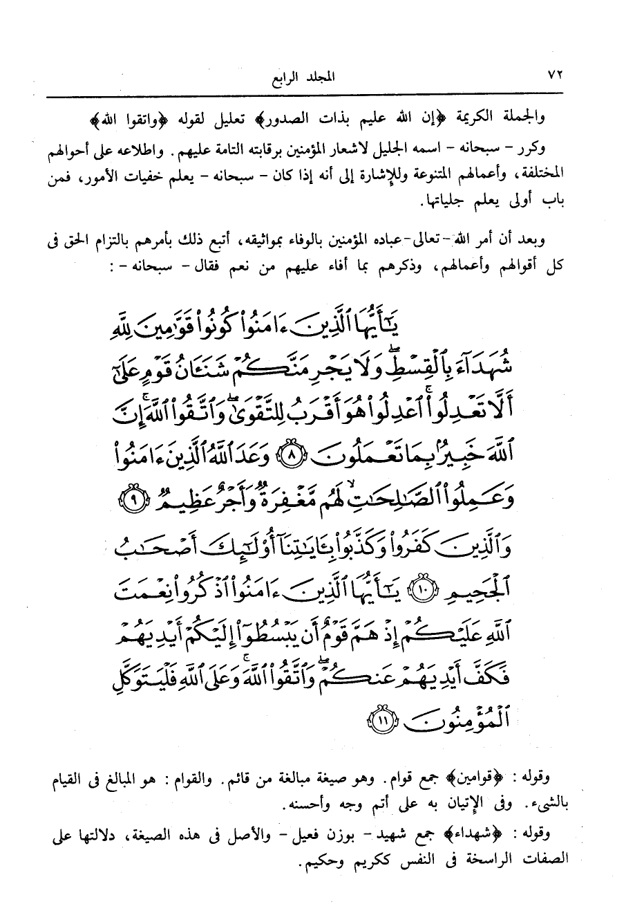 يا أَيُّهَا الَّذِينَ آمَنُوا كُونُوا قَوَّامِينَ لِلَّهِ شُهَداءَ بِالْقِسْطِ وَلا يَجْرِمَنَّكُمْ شَنَآنُ قَوْمٍ عَلى أَلاَّ تَعْدِلُوا اعْدِلُوا هُوَ أَقْرَبُ لِلتَّقْوى وَاتَّقُوا اللَّهَ إِنَّ اللَّهَ خَبِيرٌ بِما تَعْمَلُونَ (8) وَعَدَ اللَّهُ الَّذِينَ آمَنُوا وَعَمِلُوا الصَّالِحاتِ لَهُمْ مَغْفِرَةٌ وَأَجْرٌ عَظِيمٌ (9) وَالَّذِينَ كَفَرُوا وَكَذَّبُوا بِآياتِنا أُولئِكَ أَصْحابُ الْجَحِيمِ (10) يا أَيُّهَا الَّذِينَ آمَنُوا اذْكُرُوا نِعْمَتَ اللَّهِ عَلَيْكُمْ إِذْ هَمَّ قَوْمٌ أَنْ يَبْسُطُوا إِلَيْكُمْ أَيْدِيَهُمْ فَكَفَّ أَيْدِيَهُمْ عَنْكُمْ وَاتَّقُوا اللَّهَ وَعَلَى اللَّهِ فَلْيَتَوَكَّلِ الْمُؤْمِنُونَ (11)