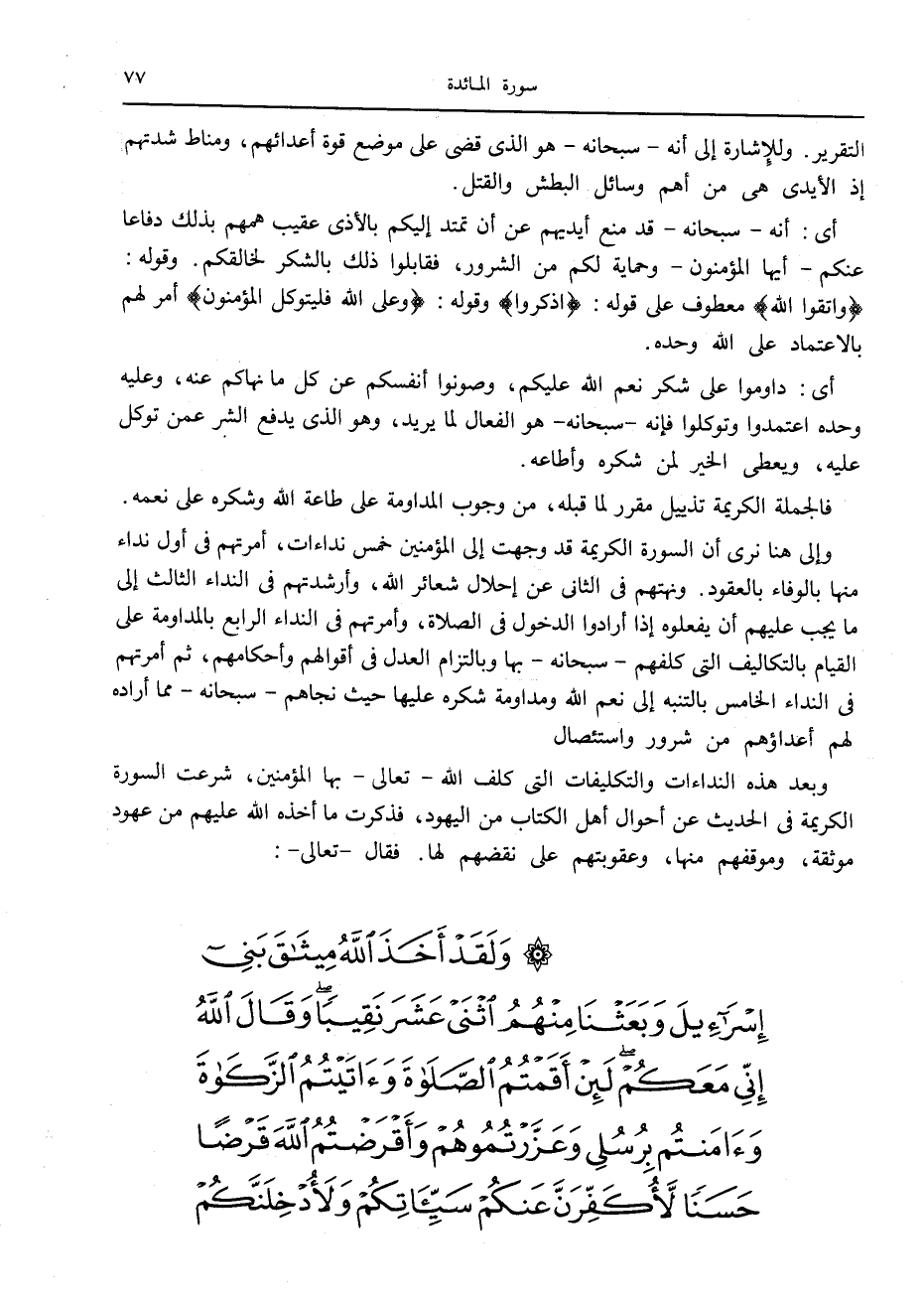 وإلى هنا نرى أن السورة الكريمة قد وجهت إلى المؤمنين خمسة نداءات، أمرتهم في أول نداء منها بالوفاء بالعقود. ونهتهم في الثاني عن إحلال شعائر الله، وأرشدتهم في النداء الثالث إلى ما يجب عليهم أن يفعلوه إذا أرادوا الدخول في الصلاة، وأمرتهم في النداء الرابع بالمداومة على القيام بالتكاليف التي كلفهم- سبحانه- بها وبالتزام العدل في أقوالهم وأحكامهم، ثم أمرتهم في النداء الخامس بالتنبه إلى نعم الله ومداومة شكره عليها حيث نجاهم- سبحانه- مما أراده لهم أعداؤهم من شرور واستئصال وبعد هذه النداءات والتكليفات التي كلف الله- تعالى- بها المؤمنين، شرعت السورة الكريمة في الحديث عن أحوال أهل الكتاب من اليهود، فذكرت ما أخذه الله عليهم من عهود موثقة، وموقفهم منها، وعقوبتهم على نقضهم لها. فقال- تعالى-: