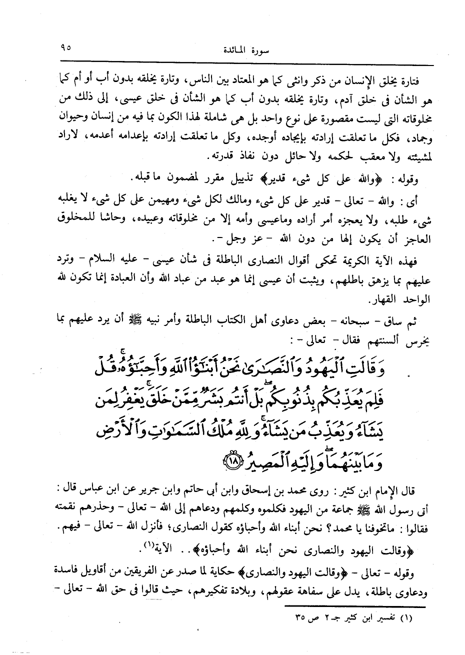 وَقالَتِ الْيَهُودُ وَالنَّصارى نَحْنُ أَبْناءُ اللَّهِ وَأَحِبَّاؤُهُ قُلْ فَلِمَ يُعَذِّبُكُمْ بِذُنُوبِكُمْ بَلْ أَنْتُمْ بَشَرٌ مِمَّنْ خَلَقَ يَغْفِرُ لِمَنْ يَشاءُ وَيُعَذِّبُ مَنْ يَشاءُ وَلِلَّهِ مُلْكُ السَّماواتِ وَالْأَرْضِ وَما بَيْنَهُما وَإِلَيْهِ الْمَصِيرُ (18)