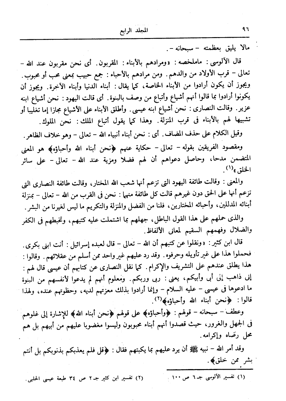 قال الآلوسى: ما ملخصه: قوله- تعالى-: «ومرادهم بالأبناء: المقربون. أى نحن مقربون عند الله- تعالى- قرب الأولاد من والدهم. ومن مرادهم بالأحباء: جمع حبيب بمعنى محب أو محبوب.