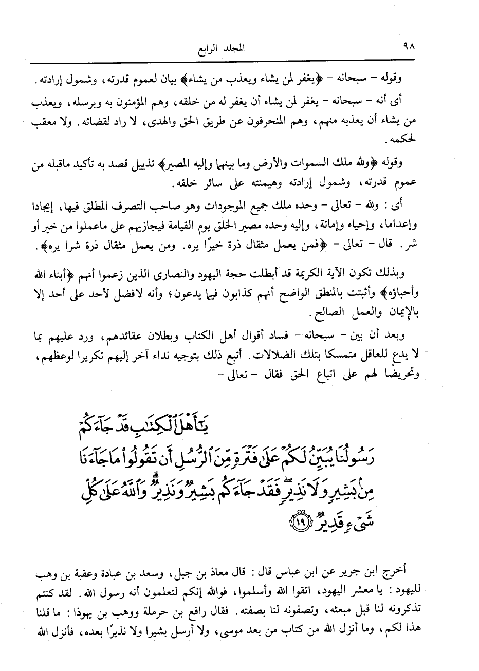 يا أَهْلَ الْكِتابِ قَدْ جاءَكُمْ رَسُولُنا يُبَيِّنُ لَكُمْ عَلى فَتْرَةٍ مِنَ الرُّسُلِ أَنْ تَقُولُوا ما جاءَنا مِنْ بَشِيرٍ وَلا نَذِيرٍ فَقَدْ جاءَكُمْ بَشِيرٌ وَنَذِيرٌ وَاللَّهُ عَلى كُلِّ شَيْءٍ قَدِيرٌ (19)