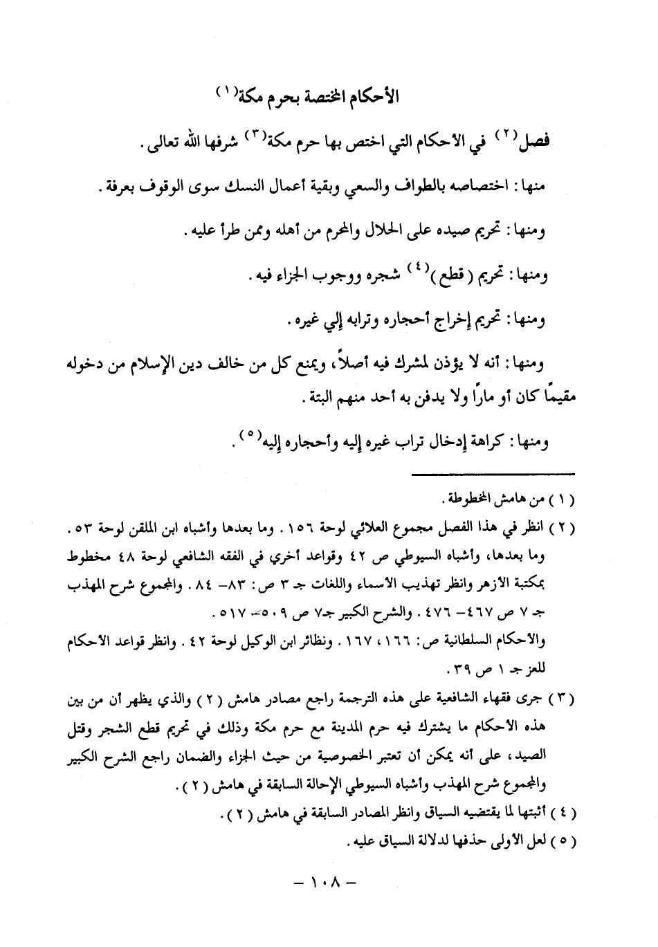 (¬3) جري فقهاء الشافعية علي هذه الترجمة راجع مصادر هامش (2) والذي يظهر أن من بين هذه الأحكام ما يشترك فيه حرم المدينة مع حرم مكة وذلك في تحريم قطع الشجر وقتل الصيد، علي أنه يمكن أن تعتبر الخصوصية من حيث الجزاء والضمان راجع الشرح الكبير والمجموع شرح المهذب وأشباه السيوطي الإِحالة السابقة في هامش (2).