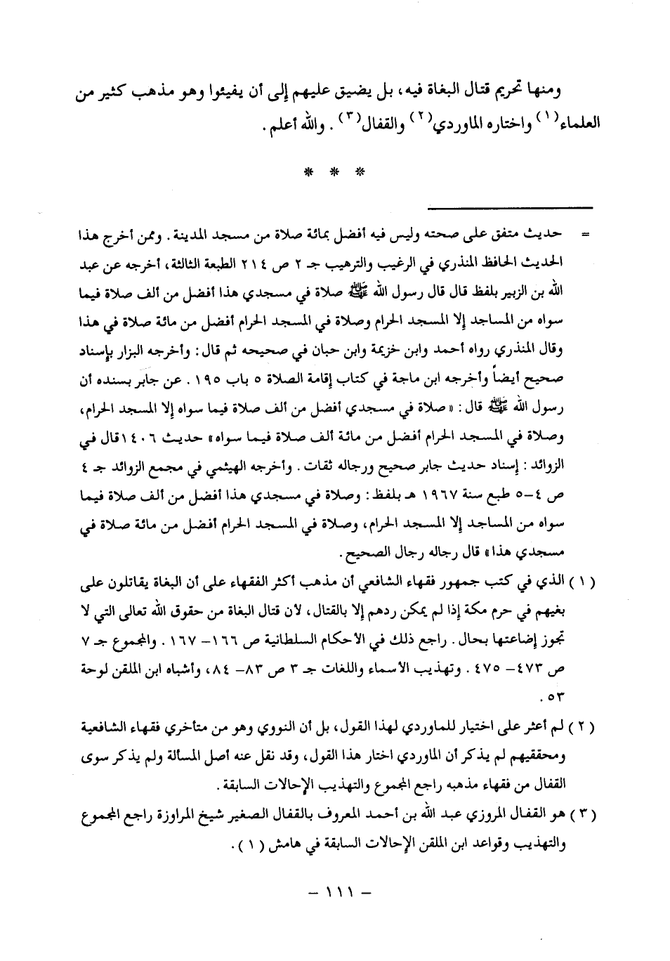 (¬1) الذي في كتب جمهور فقهاء الشافعي أن مذهب أكثر الفقهاء علي أن البغاة يقاتلون علي بغيهم في حرم مكة إذا لم يمكن ردهم إِلا بالقتال؛ لأن قتال البغاة من حقرق الله تعالي التي لا تجوز إِضاعتها بحال. راجع ذلك في الأحكام السلطانية ص 166 - 167. والمجموع جـ 7 ص 473 - 475. وتهذيب الأسماء واللغات جـ 3 ص 83 - 84، وأشباه ابن الملقن لوحة 53.