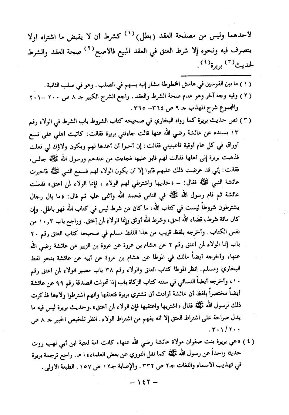 (¬3) نص حديث بريرة كما رواه البخاري في صحيحه كتاب الشروط باب الشرط في الولاء رقم 13 بسنده عن عائشة رضي الله عنها قالت جاءتني بريرة فقالت: كاتبت أهلي علي تسع أوراق في كل عام أوقية فأعينيني فقالت: إِن أحبوا أن أعدها لهم ويكون ولاؤك لي فعلت فذهبت بريرة إِلي أهلها فقالت لهم فأبو عليها فجاءت من عندهم ورسول الله - صلى الله عليه وسلم - جالس، فقالت: إِني قد عرضت ذلك عليهم فأبوا إِلا أن يكون الولاء لهم فسمع النبي - صلى الله عليه وسلم - فأخبرت عائشة النبي - صلى الله عليه وسلم - فقال: - "خذيها واشترطي لهم الولاء، فإِنما الولاء لمن أعتق" ففعلت عائشة ثم قام رسول الله - صلى الله عليه وسلم - في الناس فحمد الله وأثني عليه ثم قال: "ما بال رجال يشترطون شروطًا ليست في كتاب الله، ما كان من شرط ليس في كتاب الله فهو باطل. وإِن كان مائة شرط، قضاء الله أحق، وشرط الله أوثق وإِنما الولاء لمن أعتق. وراجع باب 3, 10 من نفس الكتاب. وأخرجه بلفظ قريب من هذا اللفظ مسلم في صحيحه كتاب العتق رقم 20 باب إِنما الولاء لمن أعتق رقم 2 عن هشام بن عروة عن عروة بن الزبير عن عائشة رضي الله عنها، وأخرجه أيضًا مالك في الموطأ عن هشام بن عروة عن أبيه عن عائشة بنحو لفظ البخاري ومسلم. انظر الموطأ كتاب العتق والولاء رقم 38 باب مصير الولاء لمن أعتق رقم 10، وأخرجه أيضًا النسائي في سننه كتاب الزكاة باب إِذا تحولت الصدقة رقم 99 عن عائشة أيضًا مختصرًا بلفظ أن عائشة أرادت أن تشتري بريرة فتعتقها وانهم اشترطوا ولاءها فذكرت ذلك لرسول الله - صلى الله عليه وسلم - فقال "اشتريها واعتقيها فإن الولاء لمن أعتق". وحديث بريرة ليس فيه ما يدل صراحة علي اشتراط العتق إِلا أنه يفهم من اشتراط الولاء. انظر تلخيص الحبير جـ 8 ص 200/ 301.