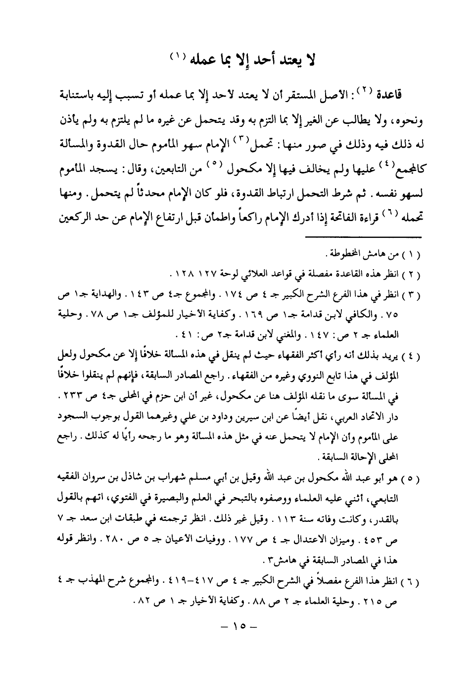 قاعدة (¬2): الأصل المستقر أن لا يعتد لأحد إِلا بما عمله أو تسبب إِليه باستنابة ونحوه، ولا يطالب عن الغير إِلا بما التزم به وقد يتحمل عن غيره ما لم يلتزم به ولم يأذن له ذلك فيه وذلك في صور منها: تحمل (¬3) الإمام سهو المأموم حال القدوة والمسألة كالمجمع (¬4) عليها ولم يخالف فيها إِلا مكحول (¬5) من التابعين، وقال: يسجد المأموم لسهو نفسه. ثم شرط التحمل ارتباط القدوة، فلو كان الإمام محدثًا لم يتحمل. ومنها تحمله (¬6) قراءة الفاتحة إِذا أدرك الإِمام راكعًا واطمأن قبل ارتفاع الإِمام عن حد الركعين