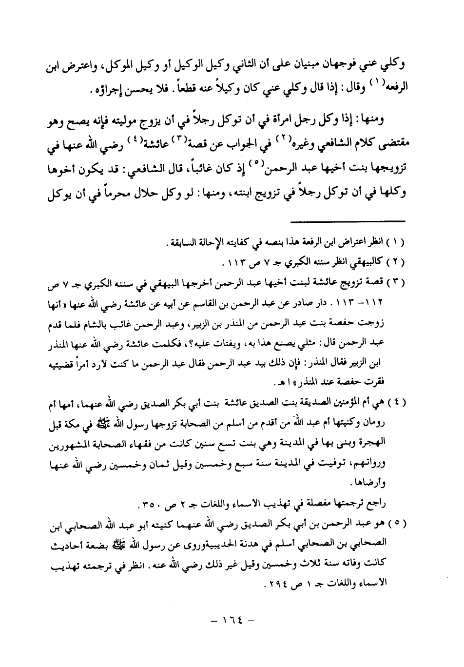 (¬3) قصة تزويج عائشة لبنت أخيها عبد الرحمن أخرجها البيهقي في سننه الكبري جـ 7 ص 112 - 113. دار صادر عن عبد الرحمن بن القاسم عن أبيه عن عائشة رضي الله عنها "أنها زوجت حفصة بنت عبد الرحمن من المنذر بن الزبير، وعبد الرحمن غائب بالشام فلما قدم عبد الرحمن قال: مثلي يصنع هذا به، ويفتات عليه؟، فكلمت عائشة رضي الله عنها المنذر ابن الزبير فقال المنذر: فإن ذلك بيد عبد الرحمن فقال عبد الرحمن ما كنت لأرد أمرًا قضيتيه فقرت حفصة عند المنذر" اهـ.
