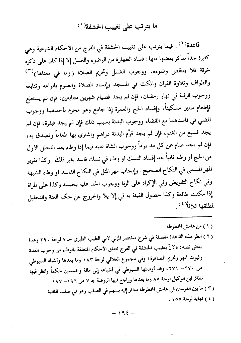 (¬2) انظر هذه القاعدة مفصلة في شرح مختصر المزني لأبي الطيب الطبري جـ 7 لوحة 290 وهذا بعض نصه: "لأنّ بتغييب الحشفة في الفرج تتعلق الأحكام المتعلقة بالوطء من وجوب العدة وثبوت المهر وتحريم المصاهرة" وفي مجموع العلائي لوحة 183 وما بعدها وأشباه السيوطي ص 270 - 271، وقد أوصلها السيوطي في أشباهه إلى مائة وخمسين حكمًا وانظر فيها نظائر ابن الوكيل لوحة 85 وما بعدها وراجع فيها الروضة جـ 7 ص 196 - 197.