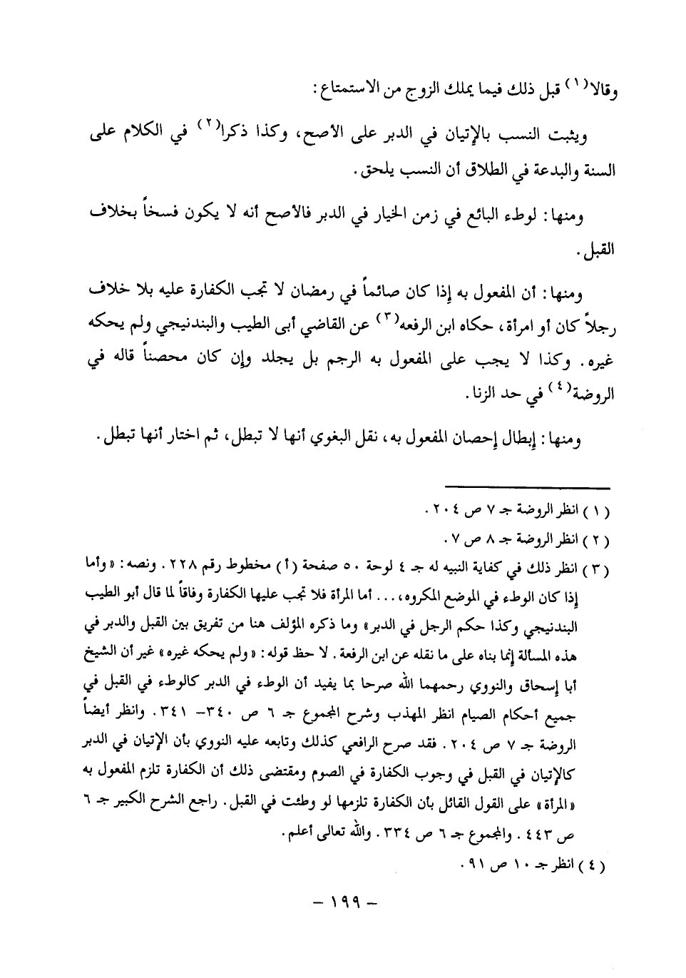 (¬3) انظر ذلك في كفاية النبيه له جـ 4 لوحة 50 صفحة (أ) مخطوط رقم 228. ونصه: "وأما إِذا كان الوطء في الوضع المكروه، ... أما المرأة فلا تجب عليها الكفارة وفاقًا لما قال أبو الطيب البندنيجي وكذا حكم الرجل في الدبر" وما ذكره المؤلف هنا من تفريق بين القبل والدبر في هذه المسألة إنما بناه على ما نقله عن ابن الرفعة. لاحظ قوله: "ولم يحكه غيره" غير أن الشيخ أبا إِسحاق والنووي رحمهما الله صرحا بما يفيد أن الوطء في الدبر كالوطء في القبل في جميع أحكام الصيام انظر المهذب وشرح المجموع جـ 6 ص 340 - 341. وانظر أيضًا الروضة جـ 7 ص 204. فقد صرح الرافعي كذلك وتابعه عليه النووي بأن الإتيان في الدبر كالإِتيان في القبل في وجوب الكفارة في الصوم ومقتضى ذلك أن الكفارة تلزم المفعول به "المرأة" على القول القائل بأن الكفارة تلزمها لو وطئت في القبل. راجع الشرح الكبير جـ 6 ص 443. والمجموع جـ 6 ص 334. والله تعالى أعلم.