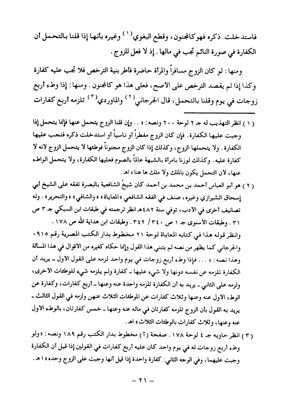 (¬3) انظر حاويه جـ 4 لوحة 178. صفحة (أ) مخطوط بدار الكتب رقم 189 ونصه: "ولو وطء أربع زوجات له في يوم واحد كان عليه أربع كفارات في القولين إذا قيل أن الكفارة وجبت عليهما، وفي الوجه الثاني: كفارة واحدة إذا قيل أنها وجبت على الزوج وحده" اهـ.