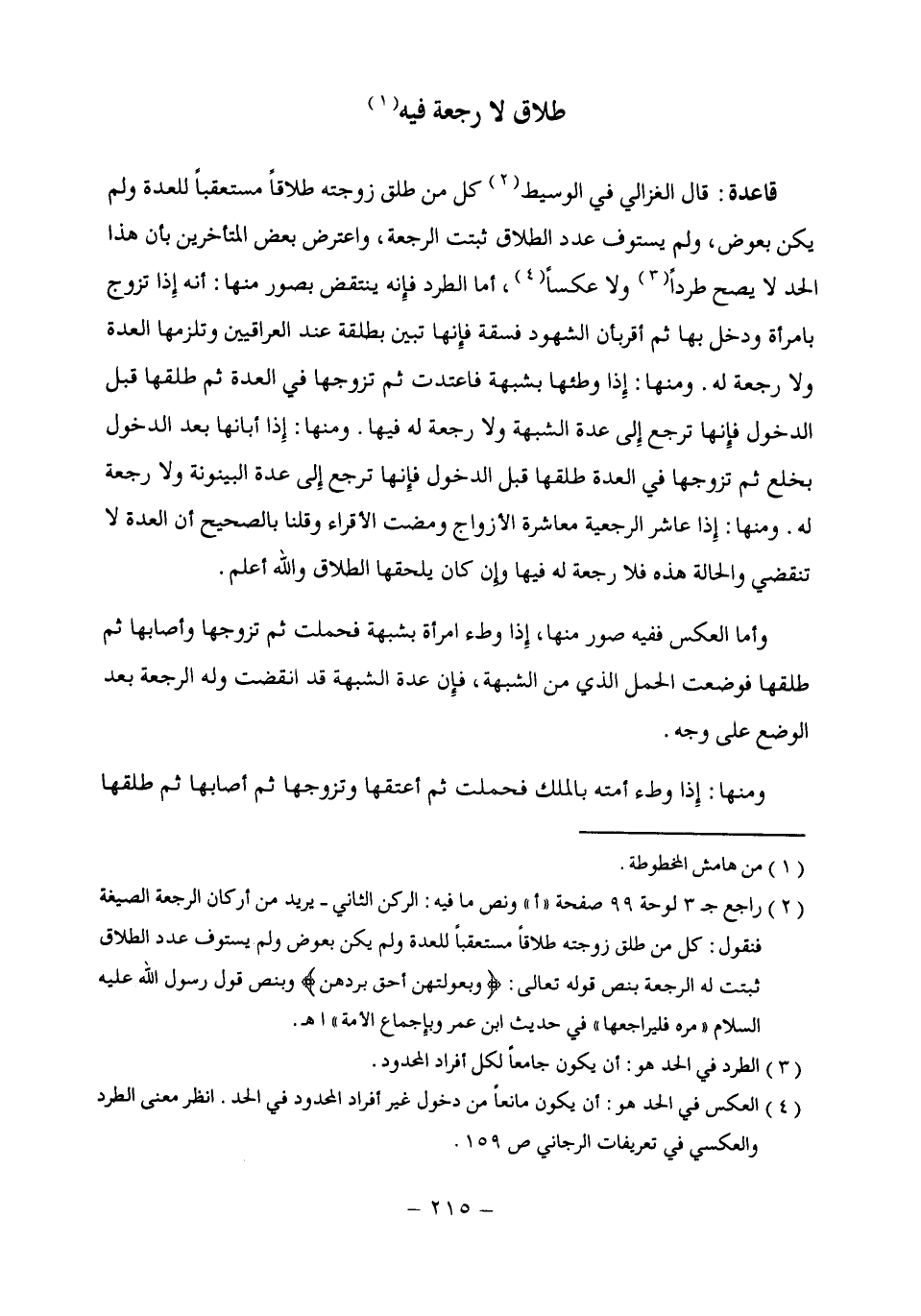 (¬2) راجع جـ 3 لوحة 99 صفحة "أ" ونص ما فيه: الركن الثاني - يريد من أركان الرجعة الصيغة فنقول: كل من طلق زوجته طلاقًا مستعقبًا للعدة ولم يكن بعوض ولم يستوف عدد الطلاق ثبتت له الرجعة بنص قوله تعالى: {وَبُعُولَتُهُنَّ أَحَقُّ بِرَدِّهِنَّ} وبنص قول رسول الله عليه السلام "مره فليراجعها" في حديث ابن عمر وبإجماع الأمة" اهـ.