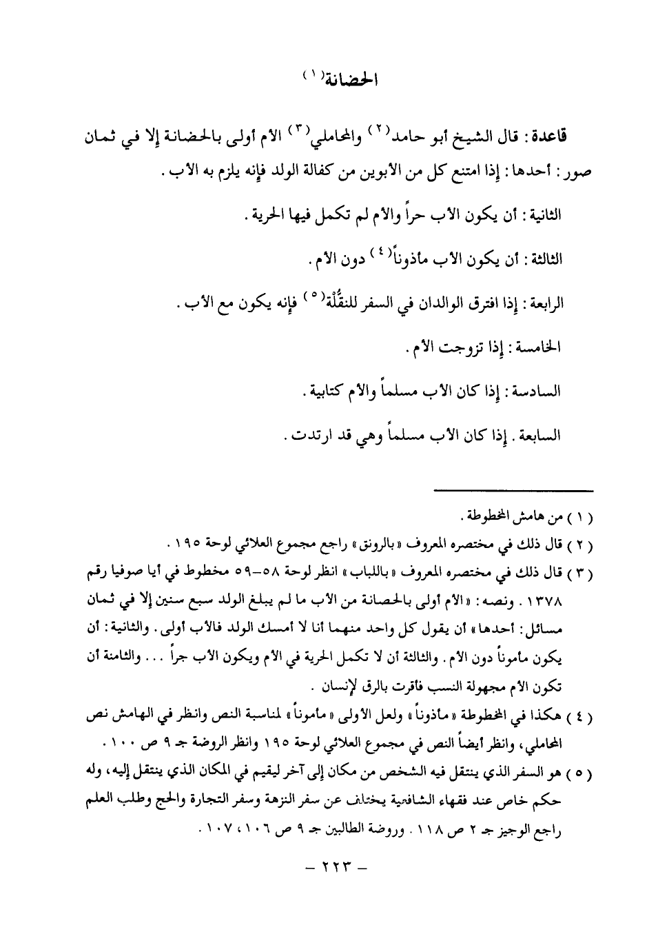 (¬3) قال ذلك في مختصره المعروف "باللباب" انظر لوحة 58 - 59 مخطوط في أيا صوفيا رقم 1378. ونصه: "الأم أولى بالحصانة من الأب ما لم يبلغ الولد سبع سنين إِلا في ثمان مسائل: أحدها" أن يقول كل واحد منهما أنا لا أمسك الولد فالأب أولى. والثانية: أن يكون مأمونًا دون الأم. والثالثة أن لا تكمل الحرية في الأم ويكون الأب جرًا ... والثامنة أن تكون الأم مجهولة النسب فأقرت بالرق لإِنسان.