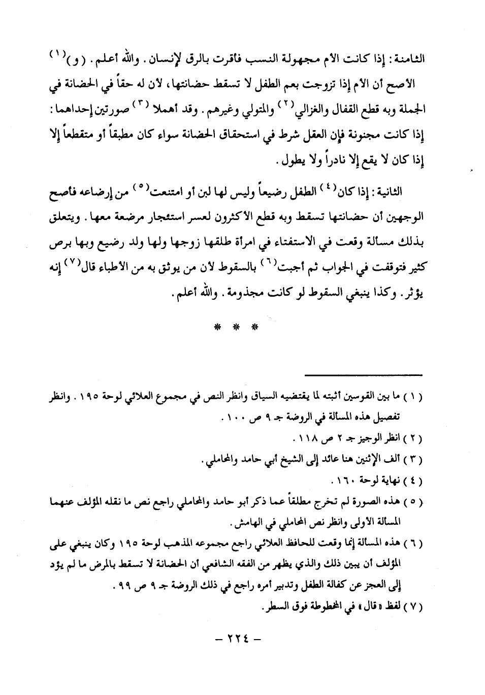 (¬6) هذه المسألة إنما وقعت للحافظ العلائي راجع مجموعه المذهب لوحة 195 وكان ينبغي على المؤلف أن يبين ذلك والذي يظهر من الفقه الشافعي أن الحضانة لا تسقط بالمرض ما لم يزد إلى العجز عن كفالة الطفل وتدبير أمره راجع في ذلك الروضة جـ 9 ص 99.