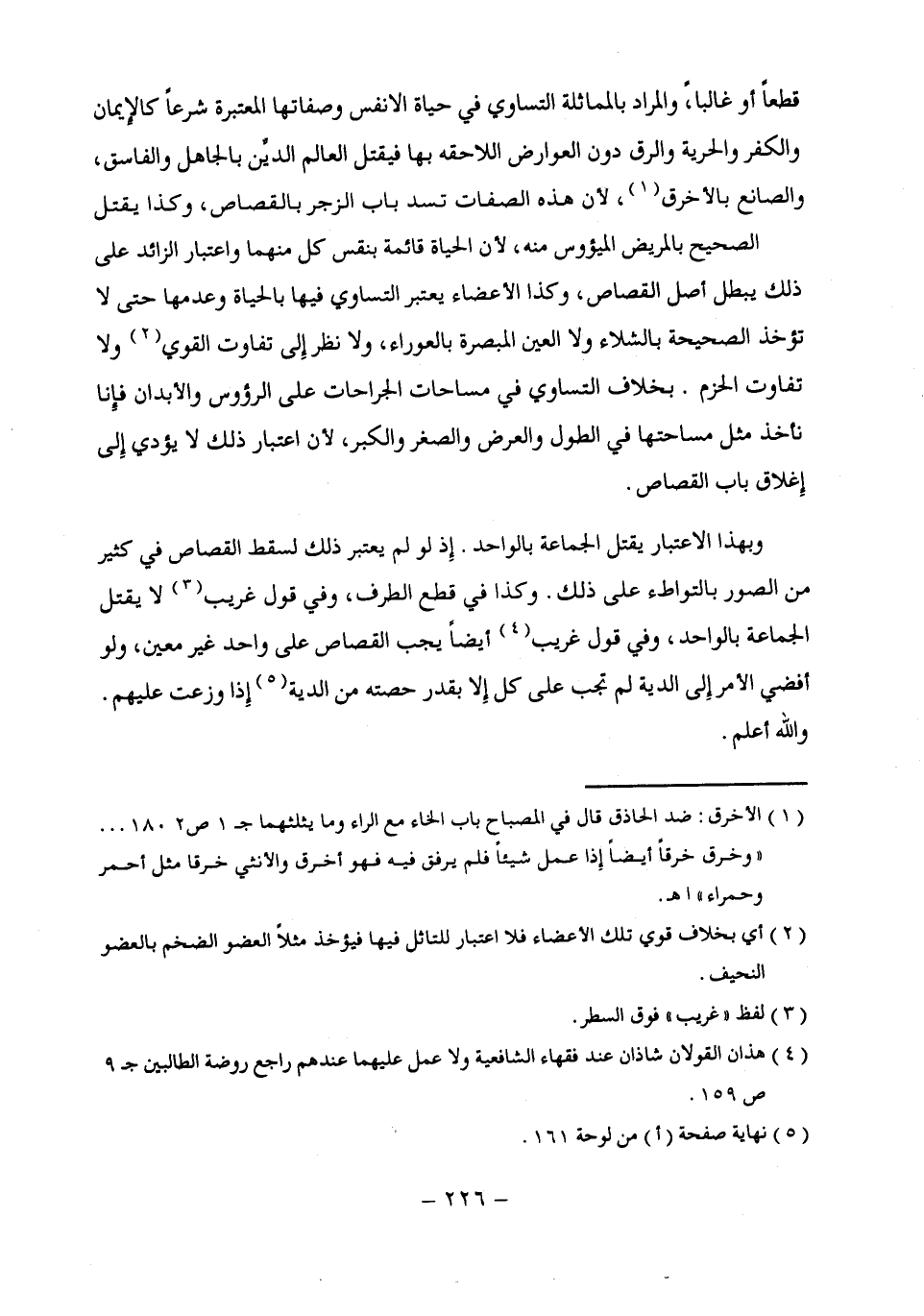 قطعًا أو غالبًا، والمراد بالمماثلة التساوي في حياة الأنفس وصفاتها المعتبرة شرعًا كالإيمان والكفر والحرية والرق دون العوارض اللاحقة بها فيقتل العالم الديِّن بالجاهل والفاسق، والصانع بالأخرق (¬1)؛ لأن هذه الصفات تسد باب الزجر بالقصاص، وكذا يقتل الصحيح بالمريض الميؤوس منه؛ لأن الحياة قائمة بنقس كل منهما واعتبار الزائد على ذلك يبطل أصل القصاص، وكذا الأعضاء يعتبر التساوي فيها بالحياة وعدمها حتى لا تؤخذ الصحيحة بالشلاء ولا العين المبصرة بالعوراء، ولا نظر إِلى تفاوت القوي (¬2) ولا تفاوت الحزم. بخلاف التساوي في مساحات الجراحات على الرؤوس والأبدان فإِنا نأخذ مثل مساحتها في الطول والعرض والصغر والأكبر, لأن اعتبار ذلك لا يؤدي إِلى إِغلاق باب القصاص.