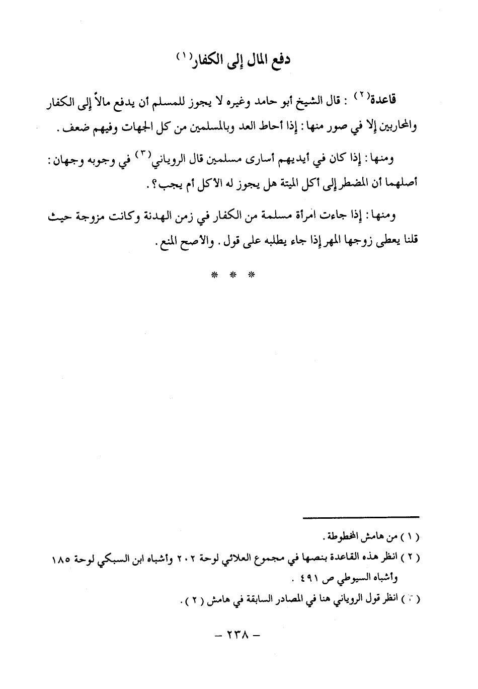 قاعدة (¬2): قال الشيخ أبو حامد وغيره لا يجوز للمسلم أن يدفع مالًا إِلى الكفار والمحاربين إِلا في صور منها: إِذا أحاط العدو بالمسلمين من كل الجهات وفيهم ضعف.