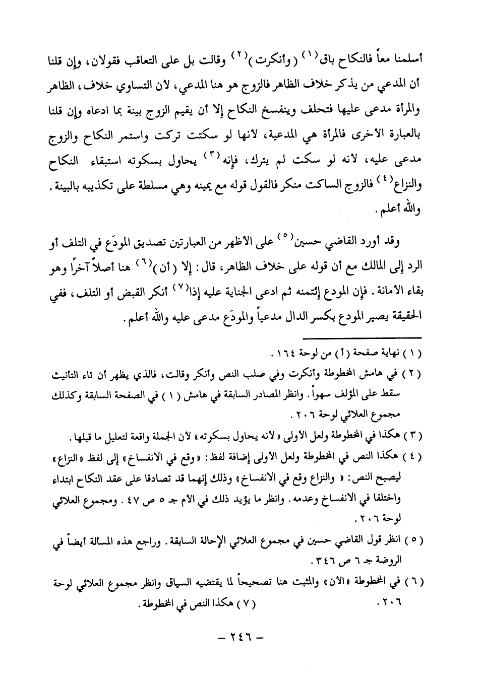 (¬4) هكذا النص في المخطوطة ولعل الأولى إضافة لفظ: "وقع في الانفساخ" إلى لفظ "النزاع" ليصبح النص: "والنزاع وقع في الانفساخ" وذلك إِنهما قد تصادقا على عقد النكاح ابتداء واختلفا في الانفساخ وعدمه. وانظر ما يؤيد ذلك في الأم جـ 5 ص 47. ومجموع العلائي لوحة 206.
