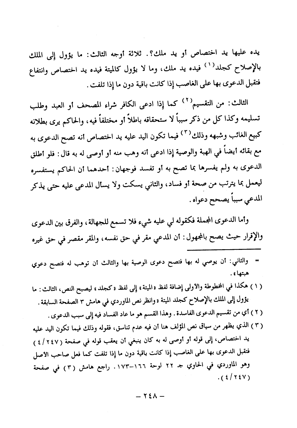 (¬3) الذي يظهر من سياق نص المؤلف هنا أن فيه عدم تناسق، فقوله وذلك فيما تكون اليد عليه يد اختصاص، إلى قوله أو أوصى له به كان ينبغي أن يعقب قوله في صفحة (4/ 247) فتقبل الدعوى بها على الغاصب إذا كانت كاقية دون ما إذا تلفت كما فعل صاحب الأصل وهو الماوردى في الحاوي جـ 22 لوحة 166 - 173. راجع هامش (3) في صفحة (4/ 247).